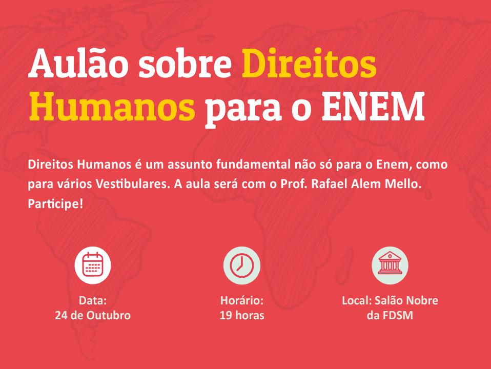 Aula com o Prof. Rafael Alem Melo sobre diversas questões relacionadas a Direitos Humanos, com o objetivo de auxiliar os estudantes na Redação do Enem.