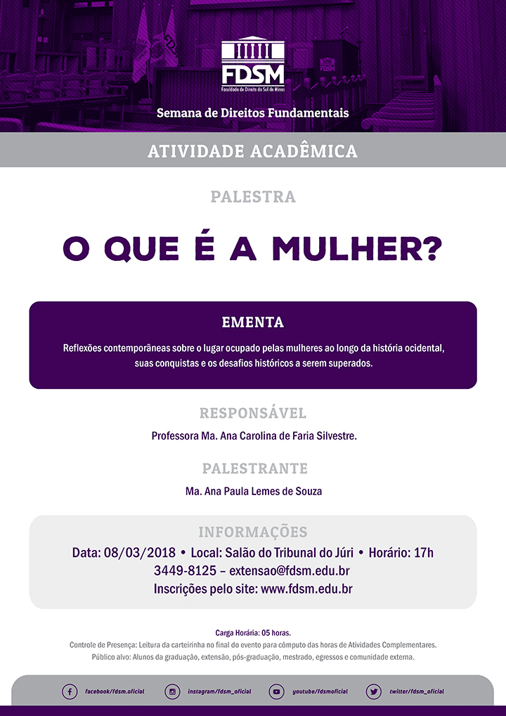 O evento ocorrerá no dia 08/03/2018, quinta-feira, às17h, no Salão do Tribunal do Júri desta instituição de ensino.