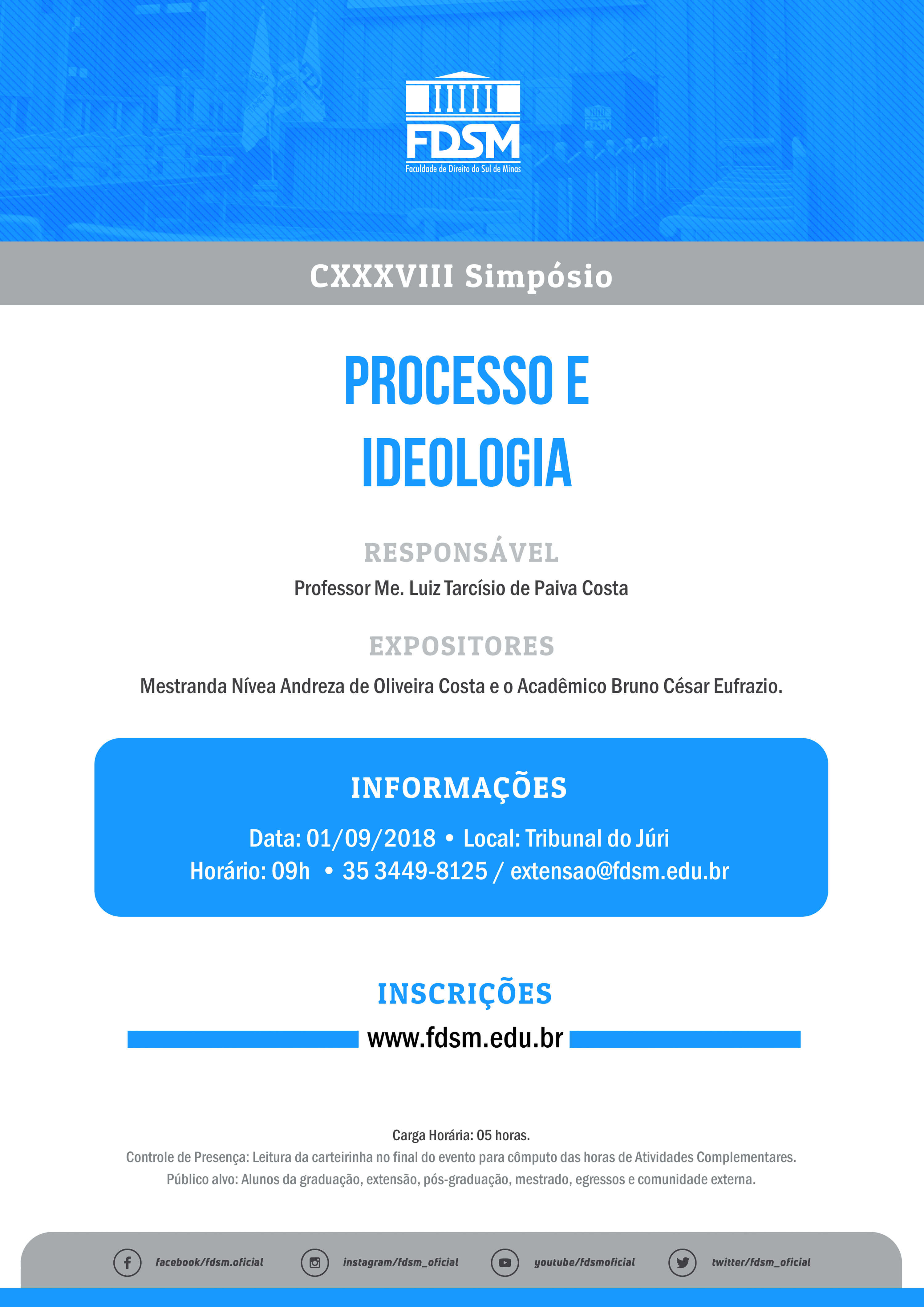 Inscrições abertas para o CXXXVIII Simpósio com o tema "Processo e Ideologia" sob a coordenação do Professor Mestre Luiz Tarcísio de Paiva Costa.
