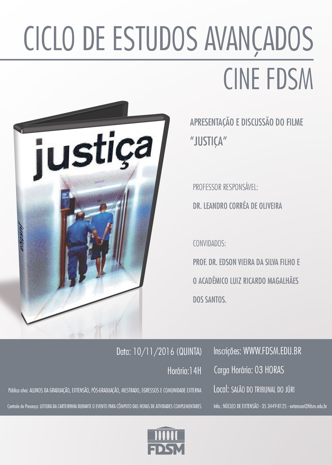 Inscrições abertas para o Ciclo de Estudos Avançados "Cine FDSM", apresentação e discussão do filme "Justiça", sob a coordenação do Professor Dr. Leandro Corrêa de Oliveira.