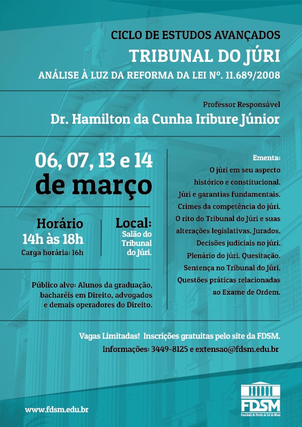 Inscrições abertas para o Ciclo de Estudos Avançados com o tema “Tribunal do Júri: Análise à Luz da Reforma da Lei nº. 11.689/2008” sob a coordenação do Professor Dr. Hamilton da Cunha Iribure Junior.