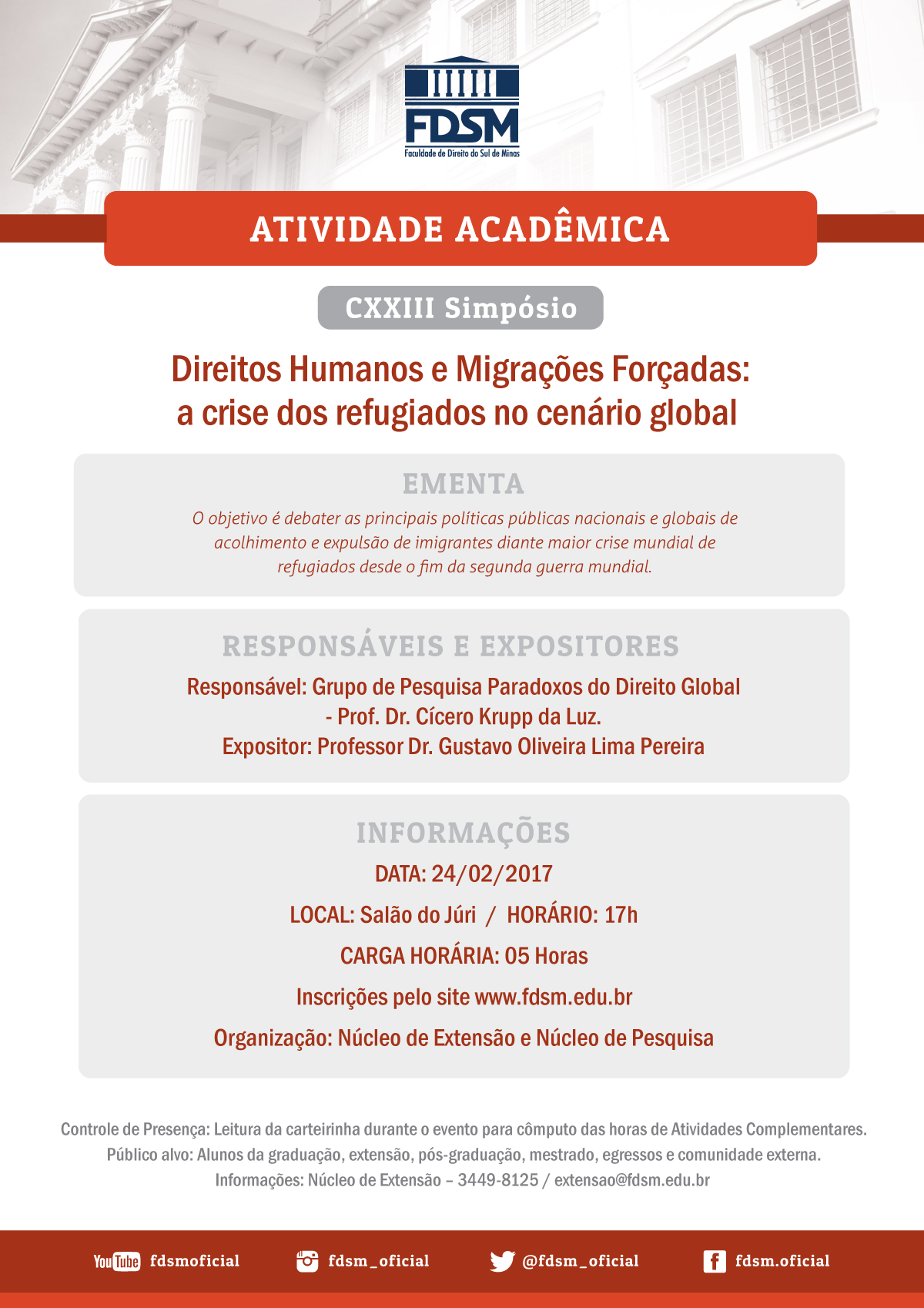 Inscrições abertas para o CXXIII Simpósio com o tema “Direitos Humanos e Migrações Forçadas: a crise dos refugiados no cenário global” sob a coordenação do Grupo de Pesquisa Paradoxos do Direito Global que tem como Pesquisador-Líder o Professor Dr. Cícero Krupp da Luz.