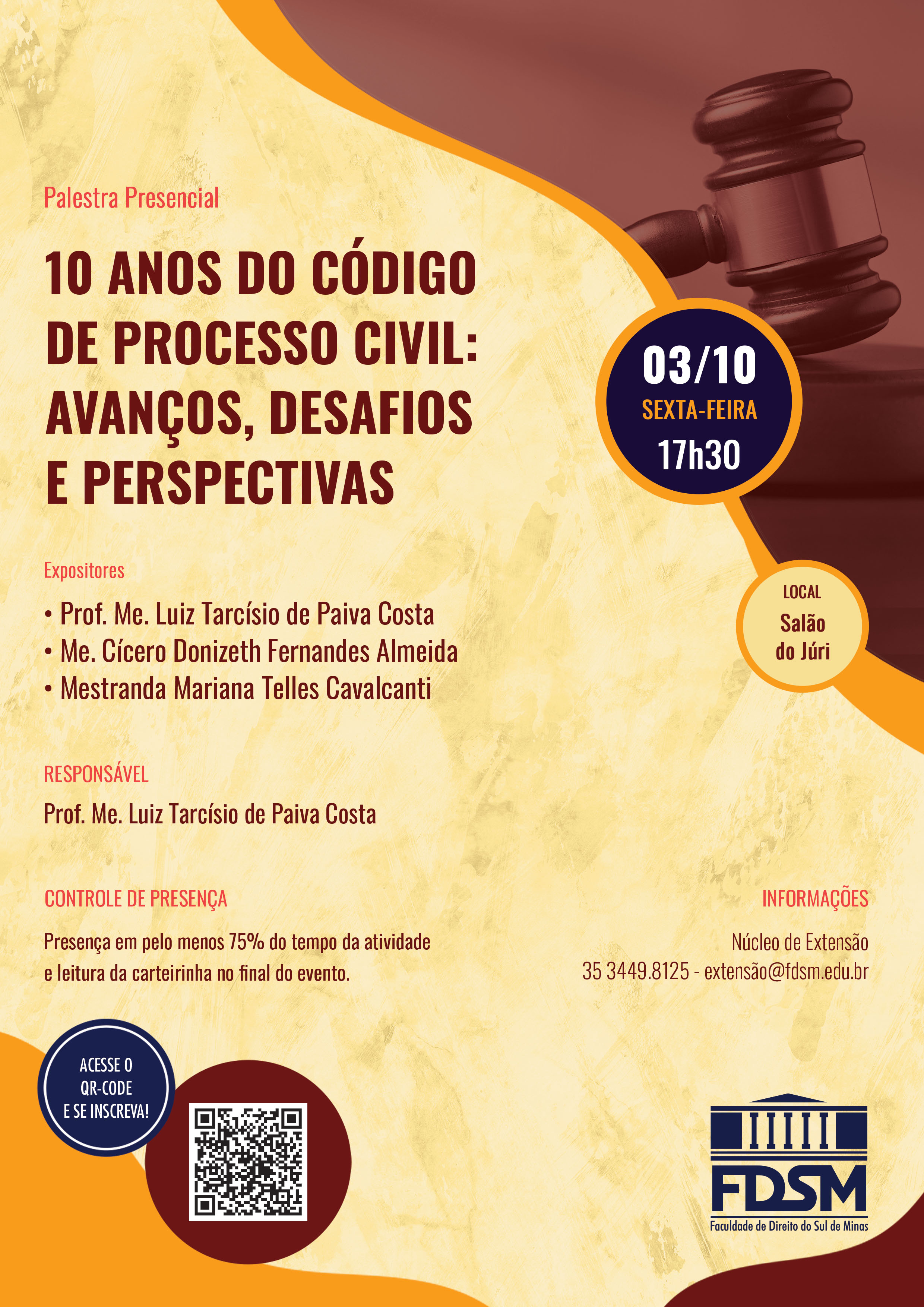 Inscrições abertas para a palestra presencial com o tema "10 Anos do Código de Processo Civil: avanços, desafios e perspectivas", sob a coordenação do Professor Mestre Luiz Tarcísio de Paiva Costa.