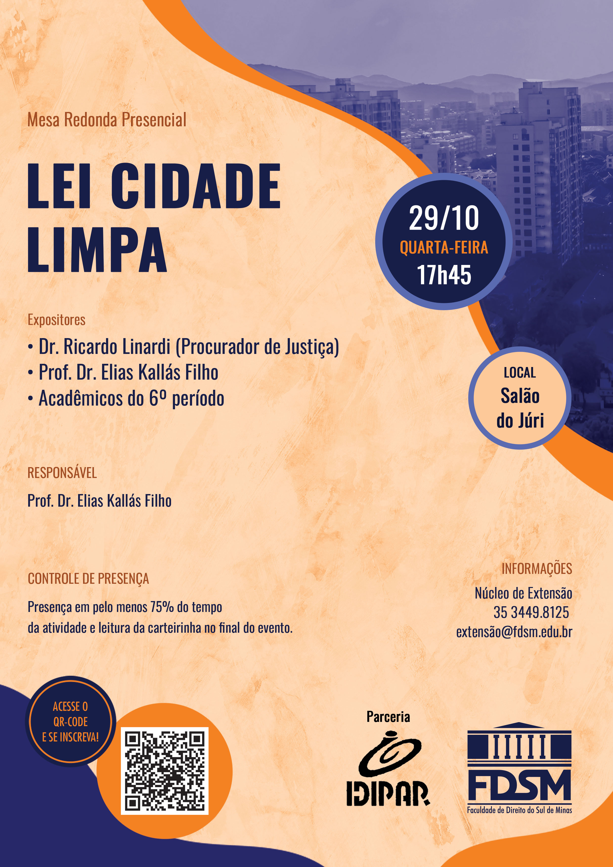 Ementa: O evento está inserido no Projeto de Extensão desenvolvido com os acadêmicos do 5º e 6º períodos da FDSM em parceria com o IDIPAR (Instituto para Desenvolvimento Integrado de Pouso Alegre e Região) e visa debater os principais aspectos da Lei Cidade Limpa, voltada à redução da poluição visual das cidades a partir da experiência de São Paulo e de outros municípios brasileiros.