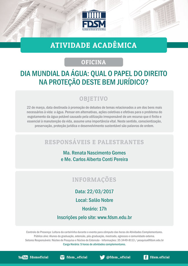 Inscrições abertas para a Oficina com o tema “Dia Mundial da Água: Qual o papel do Direito na proteção deste bem jurídico?” sob a coordenação dos Professores Ma. Renata Nascimento Gomes e Me. Carlos Alberto Conti Pereira.