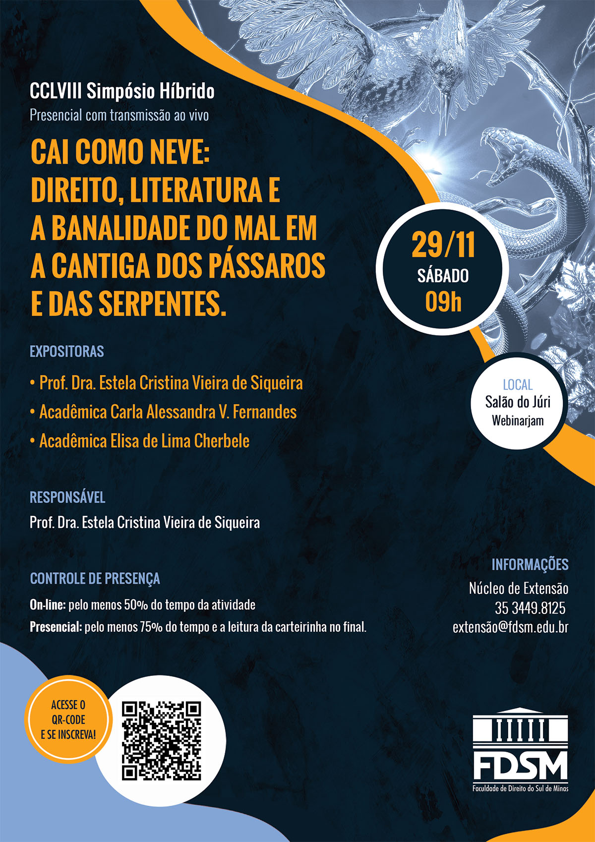 Inscrições abertas para o CCLVIII Simpósio com o tema "Cai como Neve: Direito, Literatura e a Banalidade do Mal em A Cantiga dos Pássaros e das Serpentes", sob a coordenação da Professora Doutora Estela Cristina Vieira de Siqueira.