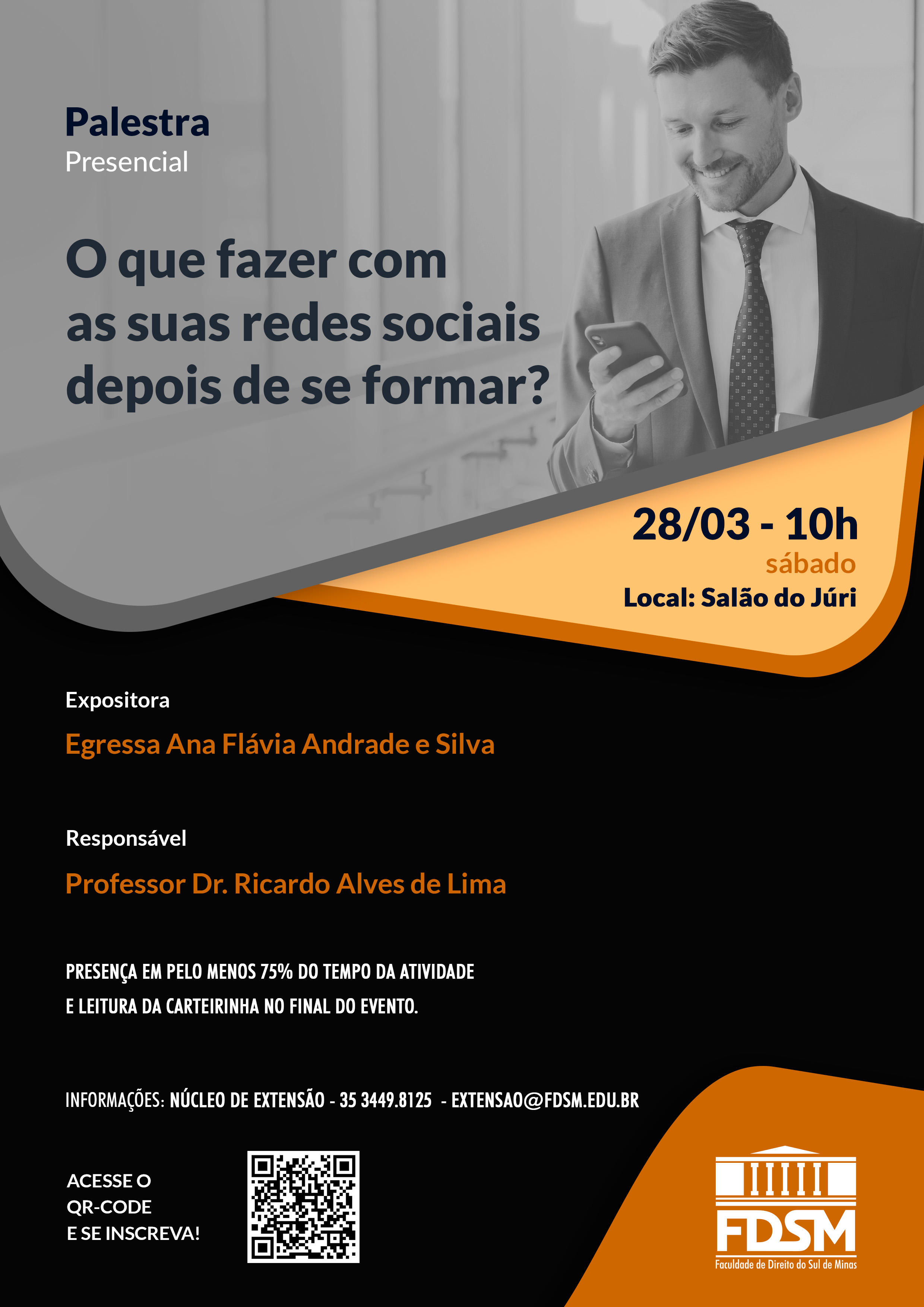 Inscrições abertas para a Palestra presencial com o tema "O que fazer com as suas redes sociais depois de se formar?", sob a coordenação do Professor Doutor Ricardo Alves de Lima.