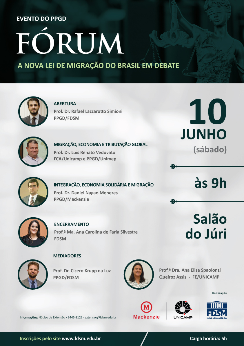 Inscrições abertas para o Fórum do PPGD - A Nova Lei de Migração do Brasil em Debate, realizado pela Mackenzie, Unicamp e FDSM.