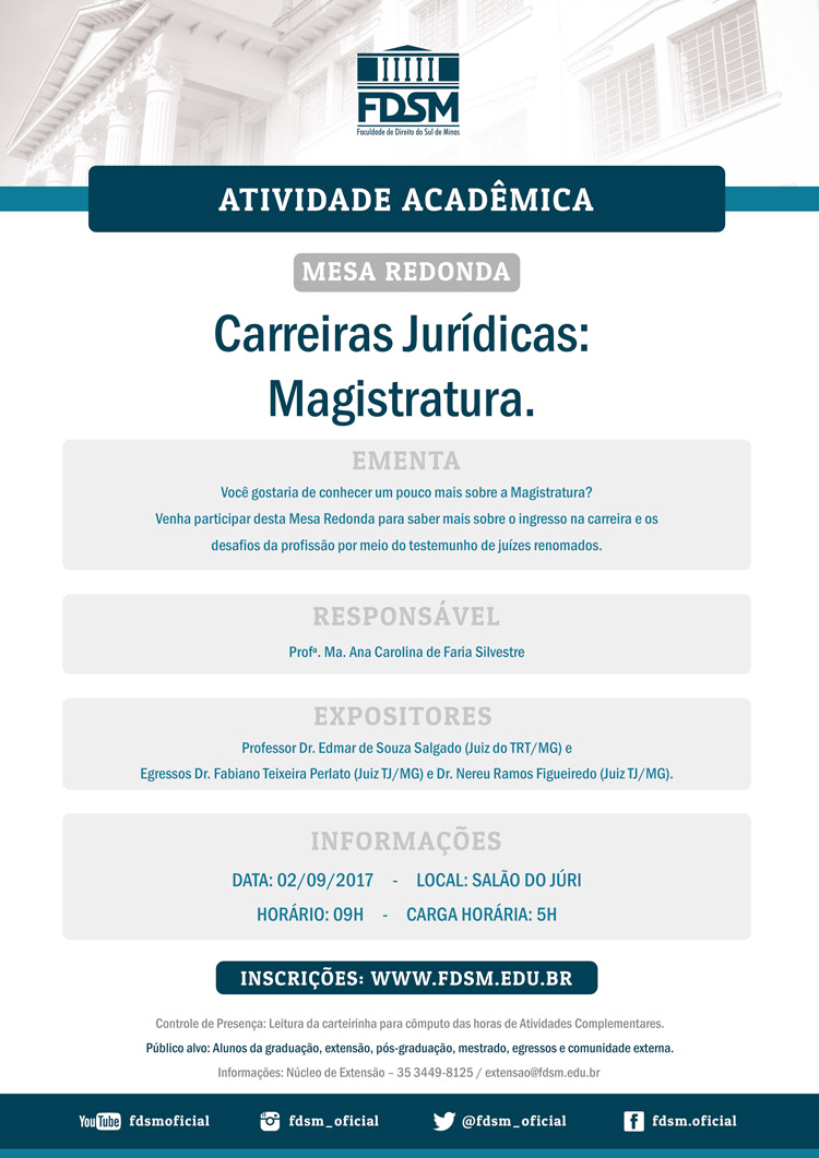 Inscrições abertas para a Mesa Redondacom o tema “Carreiras Jurídicas: Magistratura”sob a coordenação da ProfessoraMa. Ana Carolina de Faria Silvestre.