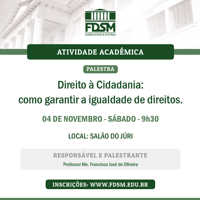 Inscrições abertas para a Palestra com o tema “Direito à Cidadania: como garantir a igualdade de direitos” sob a coordenação do Professor Me. Francisco José de Oliveira.