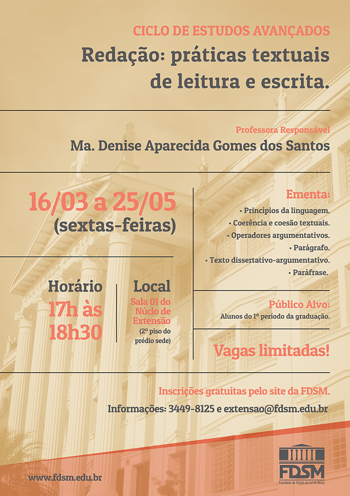 Inscrições abertas para o Ciclo de Estudos Avançados com o tema "Redação: práticas textuais de leitura e escrita" sob a coordenação da Professora Ma. Denise Aparecida Gomes dos Santos.