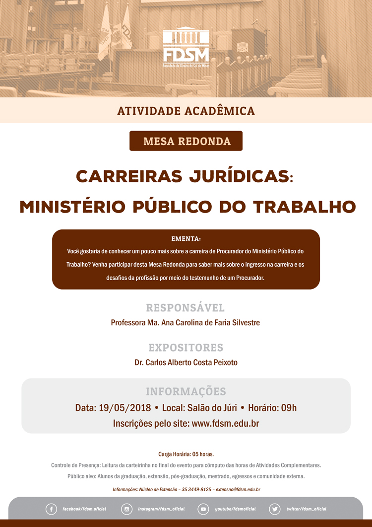 Inscrições abertas para a Mesa Redonda com o tema "Carreiras Jurídicas: Ministério Público do Trabalho", sob a coordenação dos Professores Ma. Ana Carolina de Faria Silvestre e Me. Ricardo Alves de Lima.