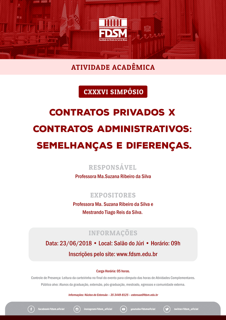 Inscrições abertas para o CXXXVI Simpósio com o tema "Contratos Privados x Contratos Administrativos: semelhanças e diferenças", sob a coordenação da Professora Mestra Suzana Ribeiro da Silva.