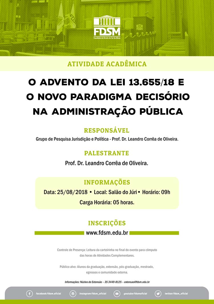 Inscrições abertas para a Palestra com o tema "O Advento da Lei 13.655/18 e o Novo Paradigma Decisório na Administração Pública" sob a coordenação do Grupo de Pesquisa Jurisdição e Política, que tem como Pesquisador-Líder o Professor Dr. Leandro Corrêa de Oliveira.
