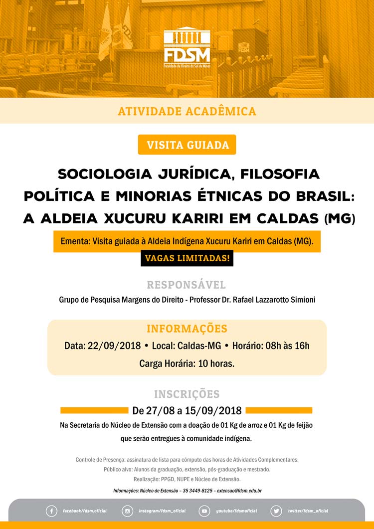 Inscrições abertas a partir de 27/08/2018, na secretaria do Núcleo de Extensão, para a Visita Guiada com o tema "Sociologia Jurídica, Filosofia Política e Minorias Étnicas do Brasil: a Aldeia Xucuru Kariri em Caldas (MG)" sob a coordenação do Grupo de Pesquisa Margens do Direito que tem como Pesquisador-Líder o Professor Dr. Rafael Lazzarotto Simioni.