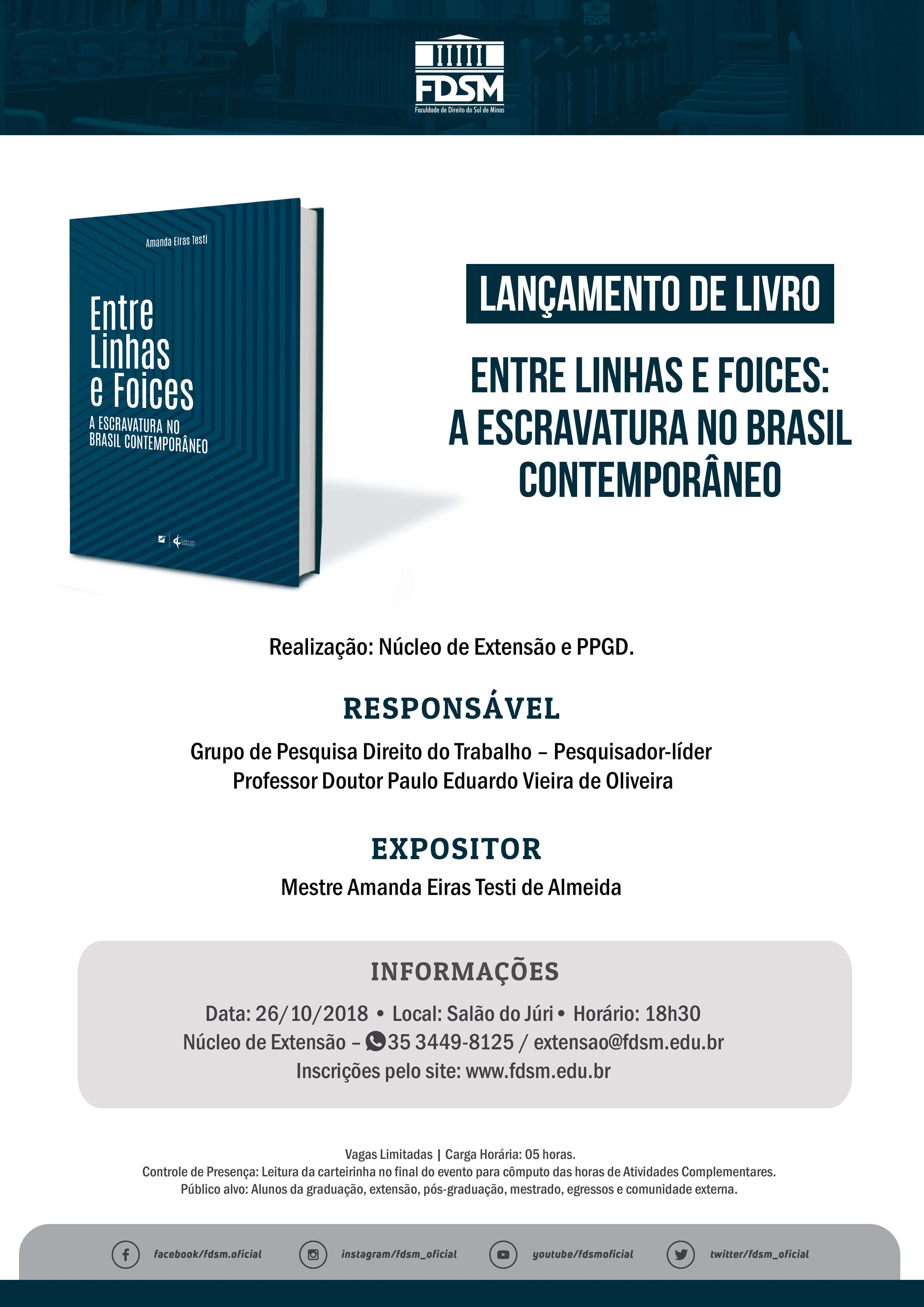 Inscrições abertas para o Lançamento do Livro intitulado "Entre Linhas e Foices: a escravatura no Brasil contemporâneo" sob a coordenação do Grupo de Pesquisa Direito do Trabalho cujo Pesquisador-líder é o Professor Doutor Paulo Eduardo Vieira de Oliveira.