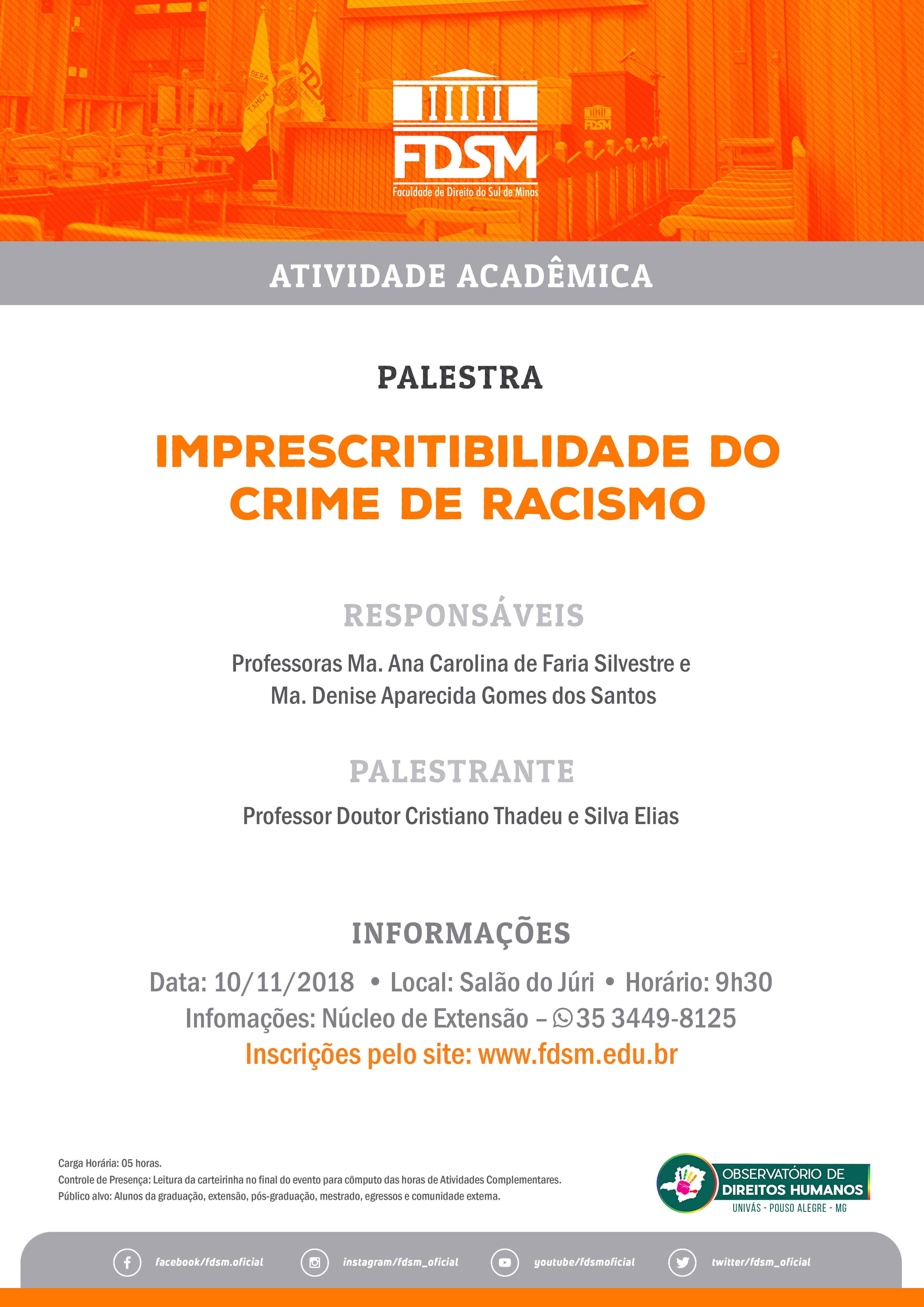 Inscrições abertas para a Palestra com o tema "Imprescritibilidade do Crime de Racismo" sob a coordenação das Professoras Ana Carolina de Faria Silvestre e Denise Aparecida Gomes dos Santos.