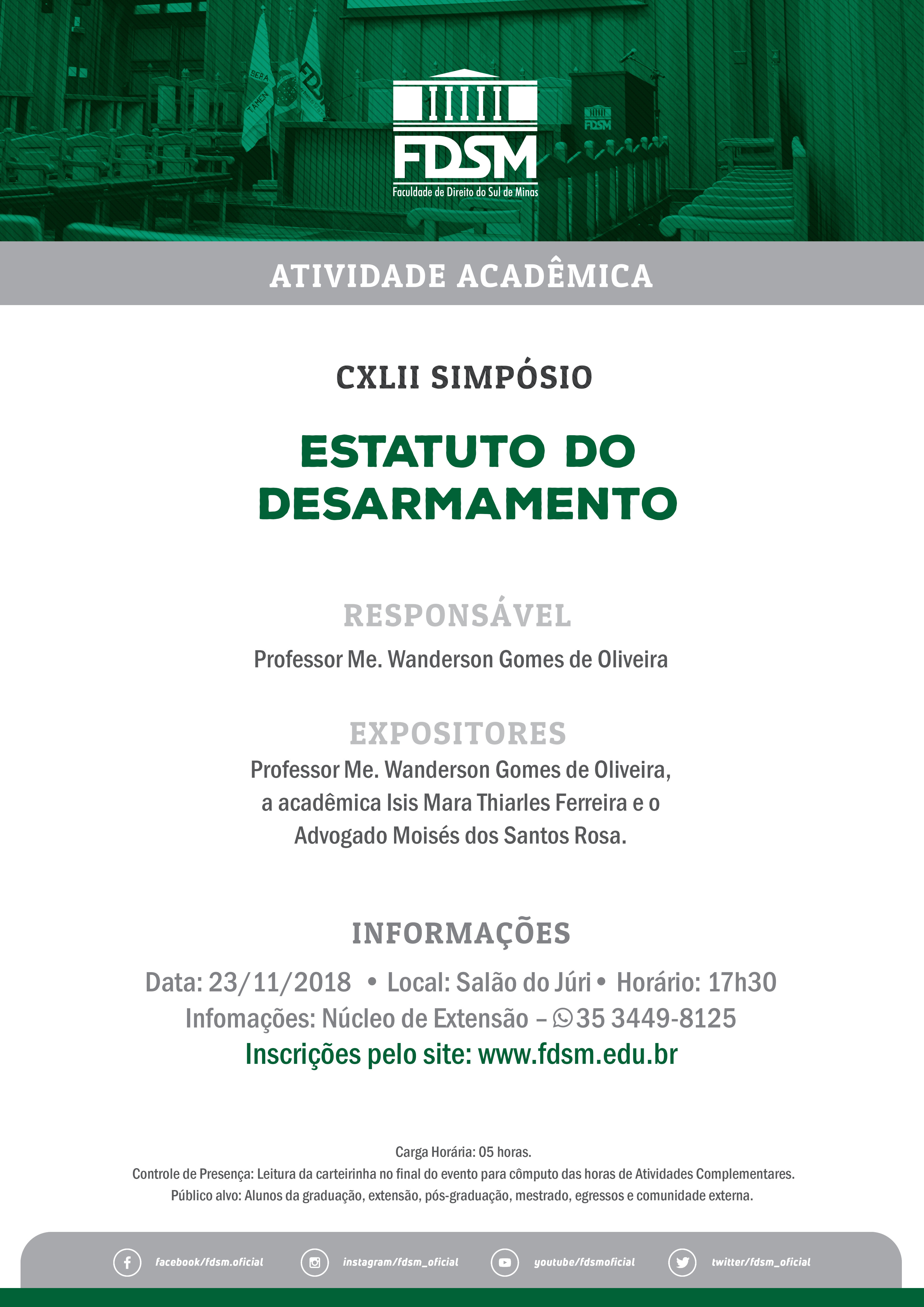 Inscrições abertas para o CXLII Simpósio com o tema "Estatuto do Desarmamento" sob a coordenação do Professor Mestre Wanderson Gomes de Oliveira.