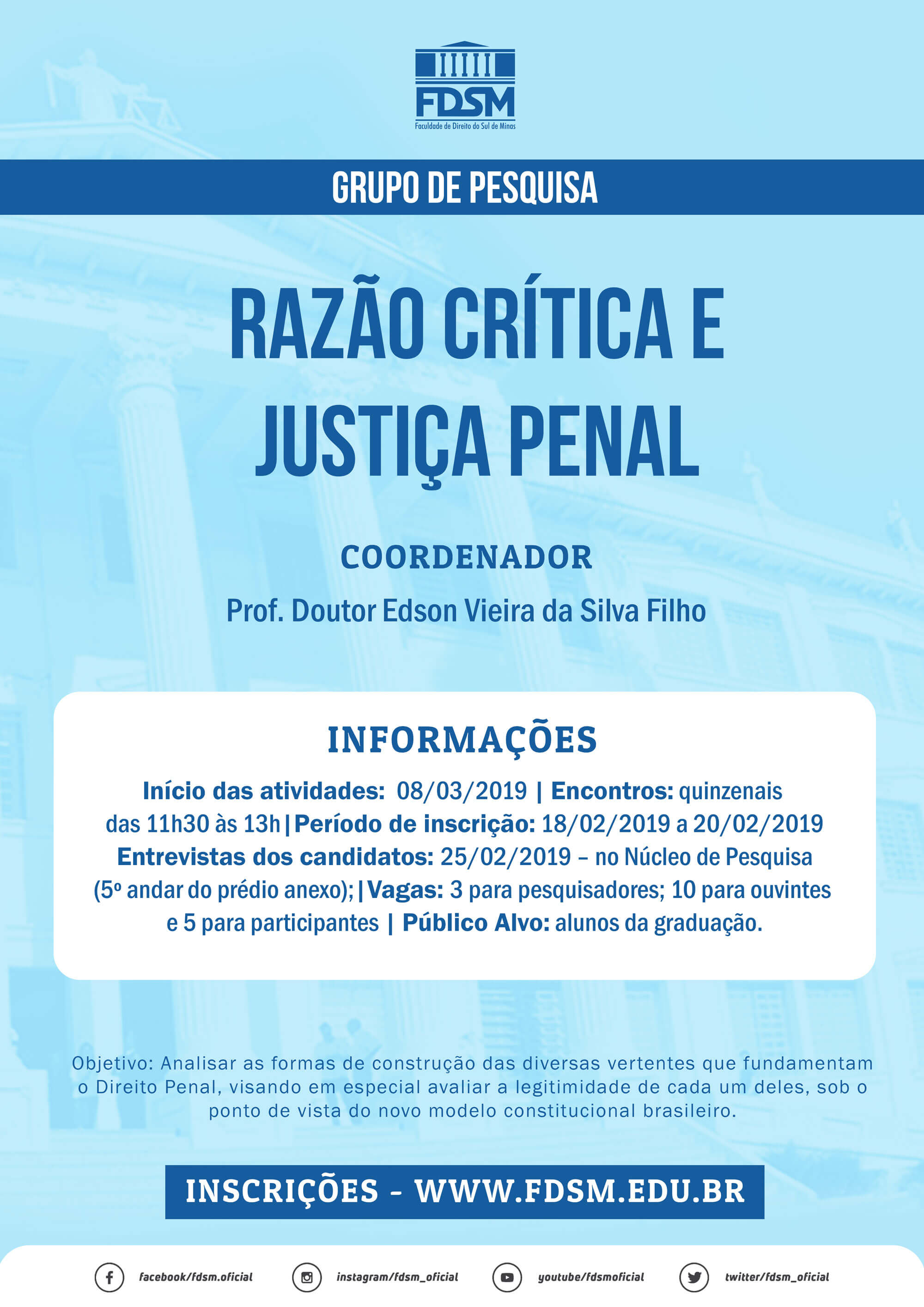 Informações: Núcleo de Pesquisa - 35 3449-8113 - pesquisa@fdsm.edu.br