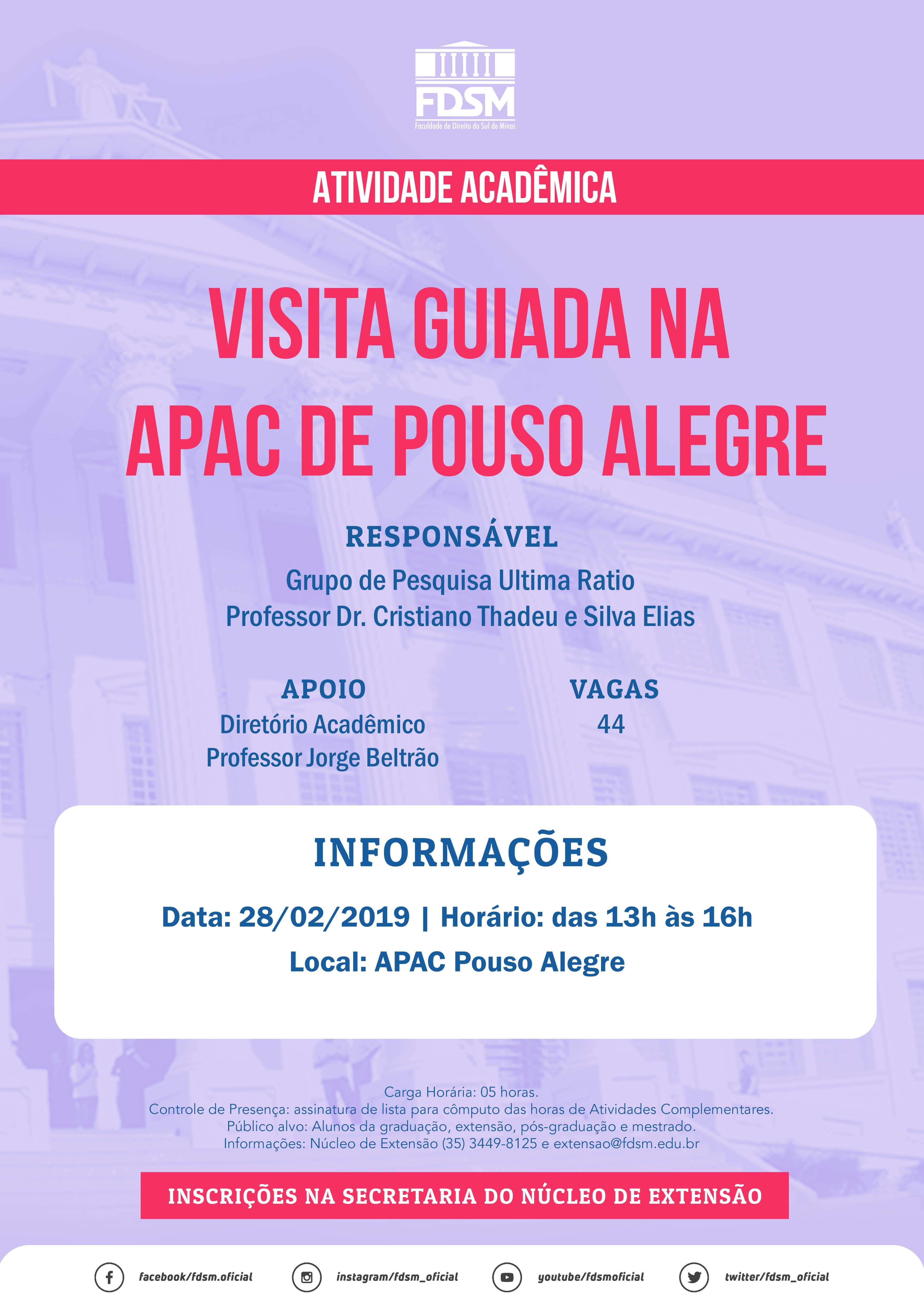 Inscrições abertas a partir de 20/02/2019, na secretaria do Núcleo de Extensão, para a Visita Guiada na APAC de Pouso Alegre sob a coordenação do Grupo de Pesquisa Ultima Ratio que tem como Pesquisador-Líder o Professor Dr. Cristiano Thadeu e Silva Elias e com o apoio do Diretório Acadêmico Professor Jorge Beltrão.