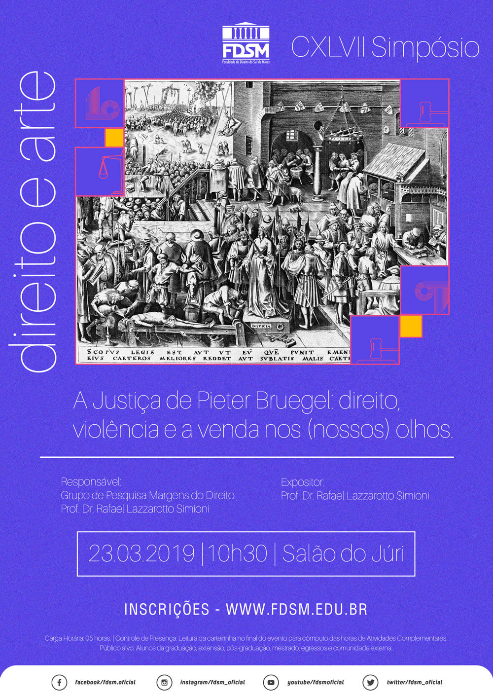 Inscrições abertas para o CXLVII Simpósio com o tema "A Justiça de Pieter Bruegel: direito, violência e a venda nos (nossos) olhos" sob a coordenação do Grupo de Pesquisa Margens do Direito cujo Pesquisador-Líder é o Professor Doutor Rafael Lazzarotto Simioni.