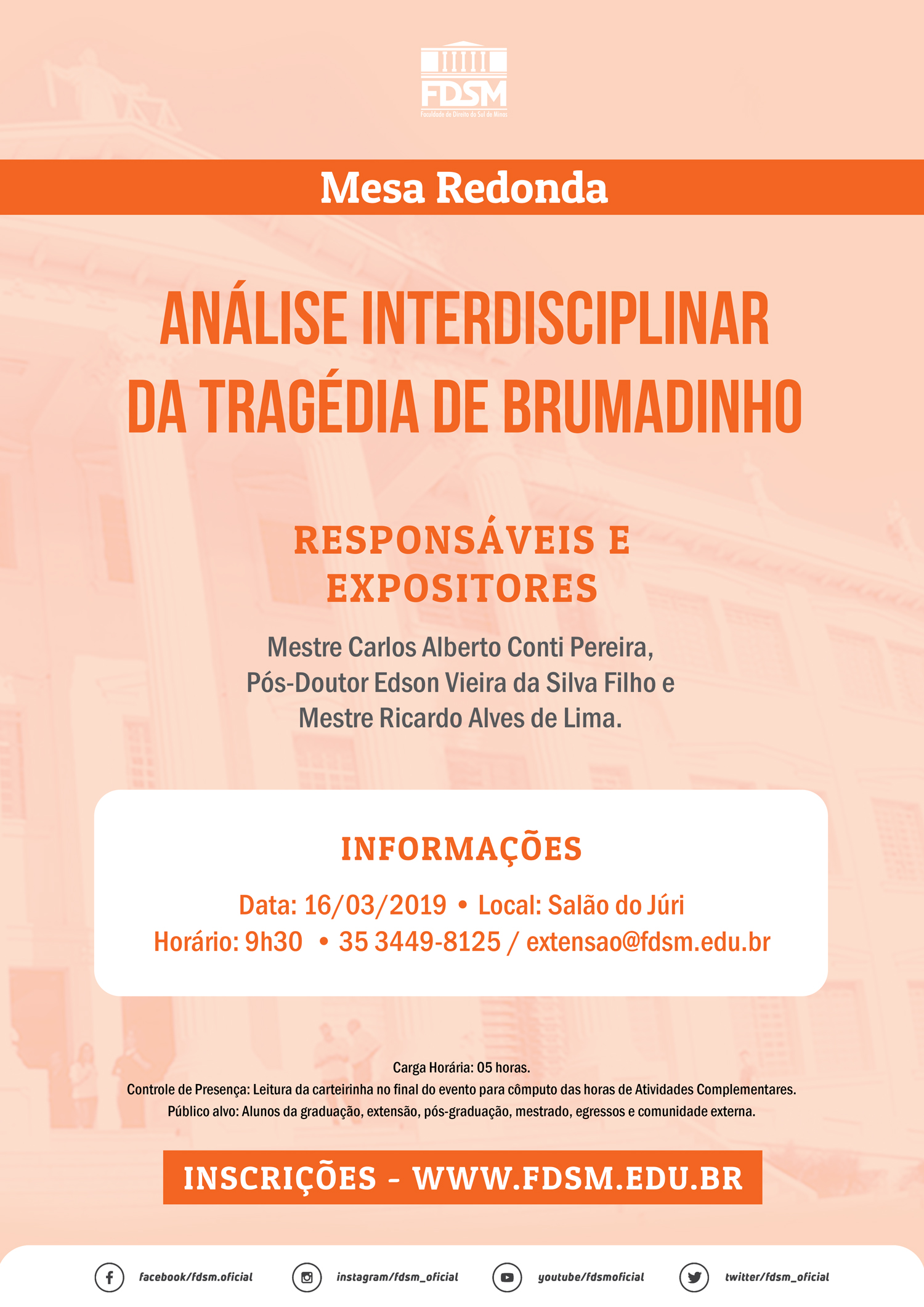 Inscrições abertas para a Mesa Redonda com o tema "Análise Interdisciplinar da Tragédia de Brumadinho" sob a coordenação do Professor Mestre Carlos Alberto Conti Pereira, Professor Pós-Doutor Edson Vieira da Silva Filho e Professor Mestre Ricardo Alves de Lima.