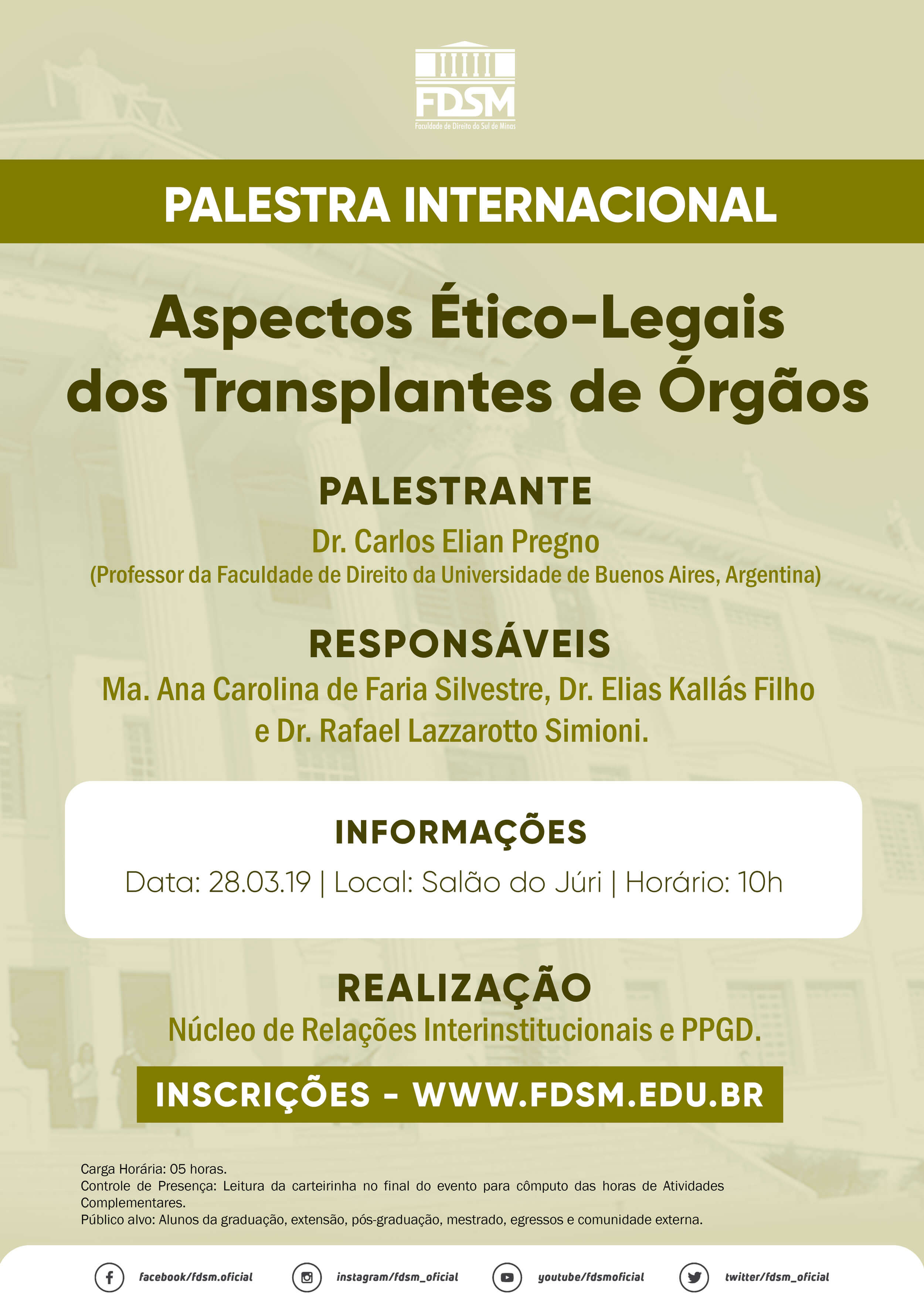 O evento ocorrerá no dia 28/03/2019, quinta-feira, às 10h, no Salão do Tribunal do Júri desta instituição de ensino.