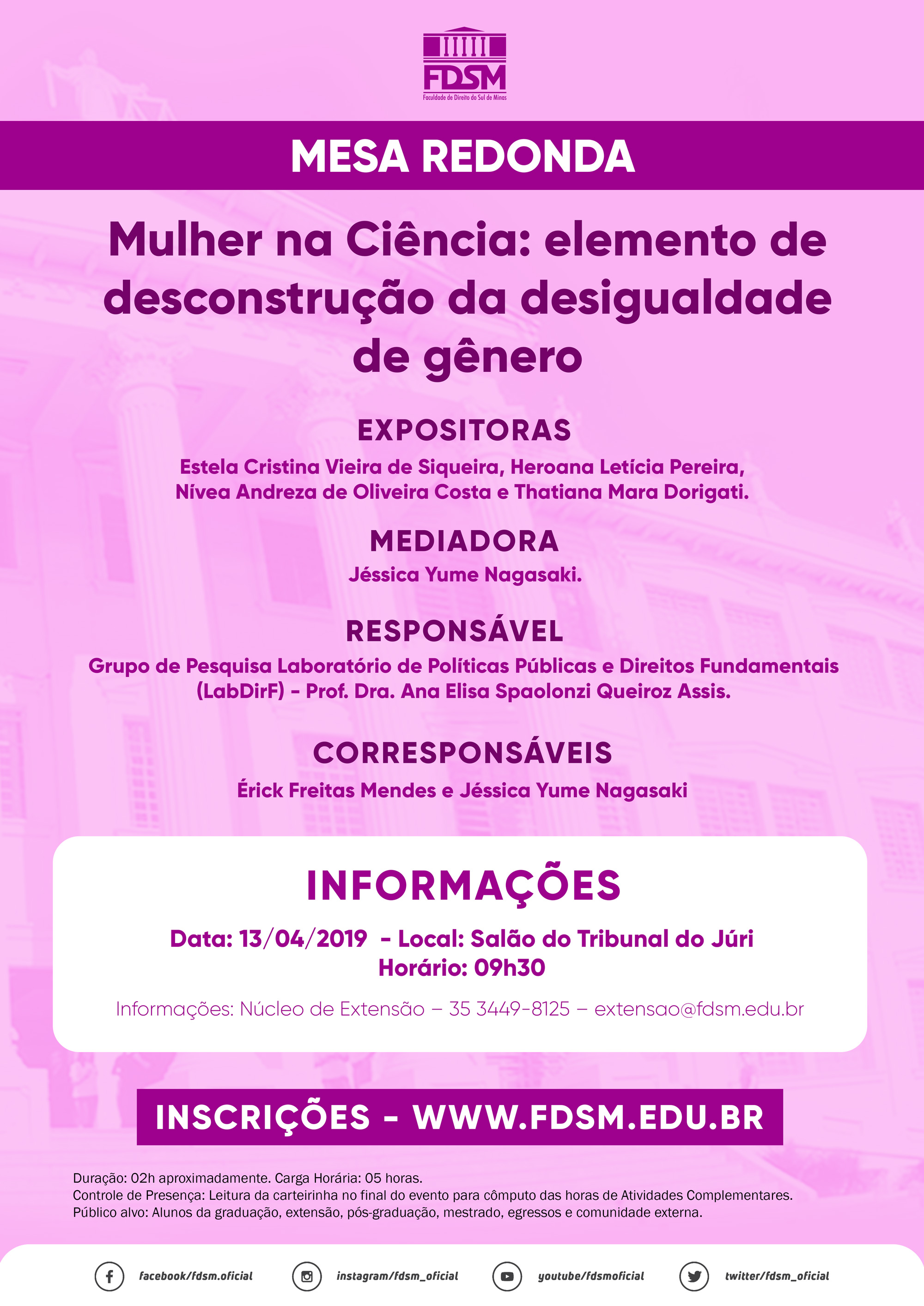 O evento ocorrerá no dia 13/04/2019, sábado, às 09h30, no Salão do Tribunal do Júri desta instituição de ensino.