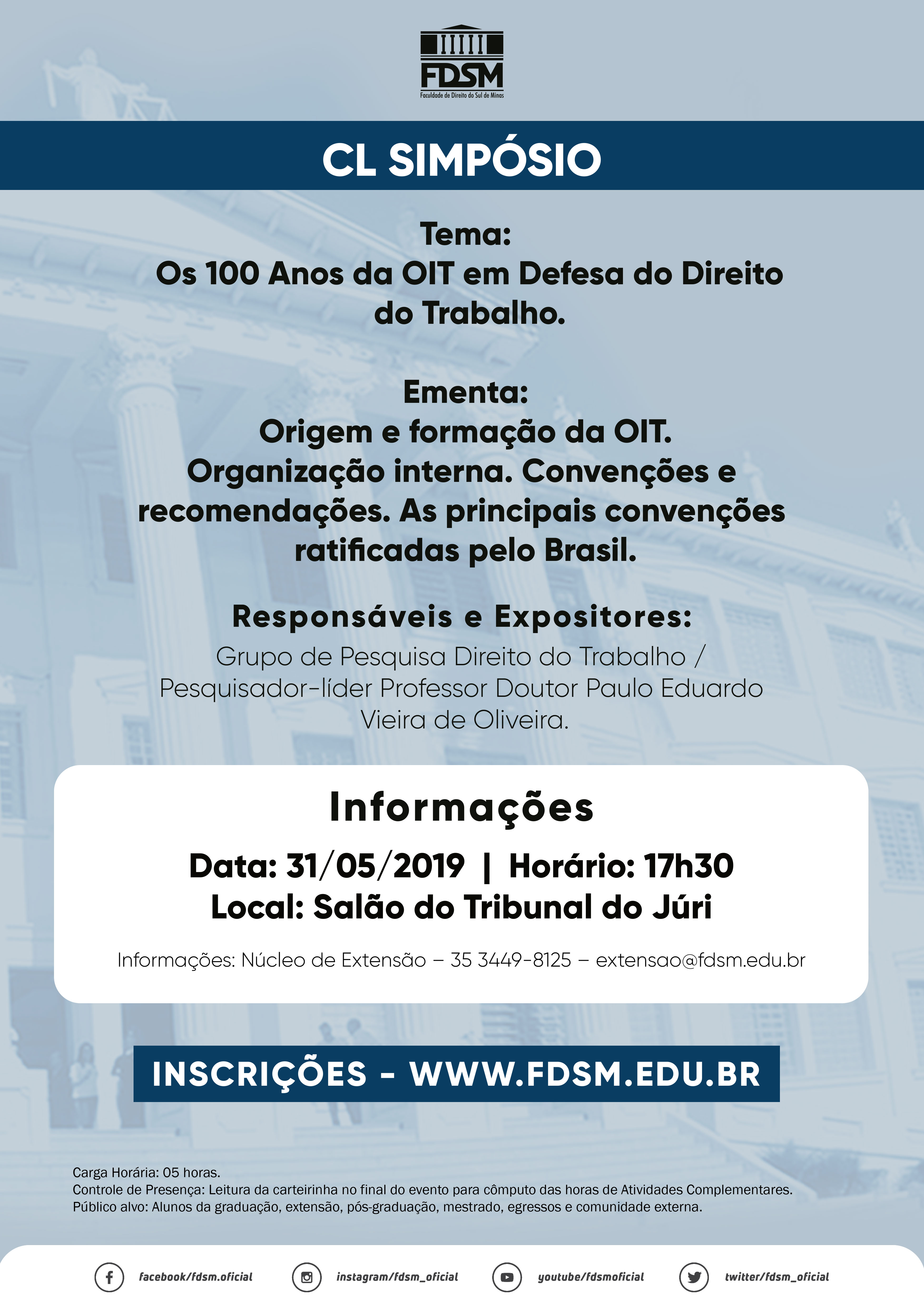 Inscrições abertas para o CL Simpósio intitulado "Os 100 Anos da OIT em Defesa do Direito do Trabalho" sob a coordenação do Grupo de Pesquisa Direito do Trabalho cujo Pesquisador-líder é o Professor Doutor Paulo Eduardo Vieira de Oliveira.