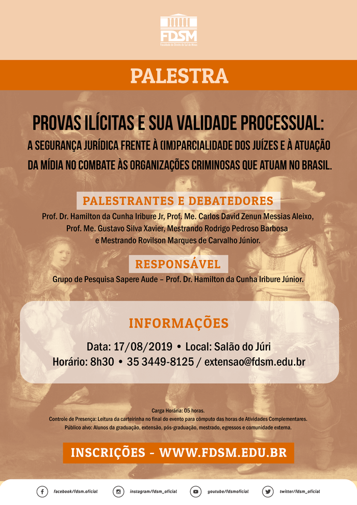 Inscrições abertas para a Palestra com o tema "Provas Ilícitas e sua Validade Processual: a segurança jurídica frente à (im)parcialidade dos juízes e à atuação da mídia no combate às organizações criminosas que atuam no Brasil" sob a coordenação do Grupo de Pesquisa Sapere Aude, cujo Pesquisador-Líder é o Professor Doutor Hamilton da Cunha Iribure Júnior.