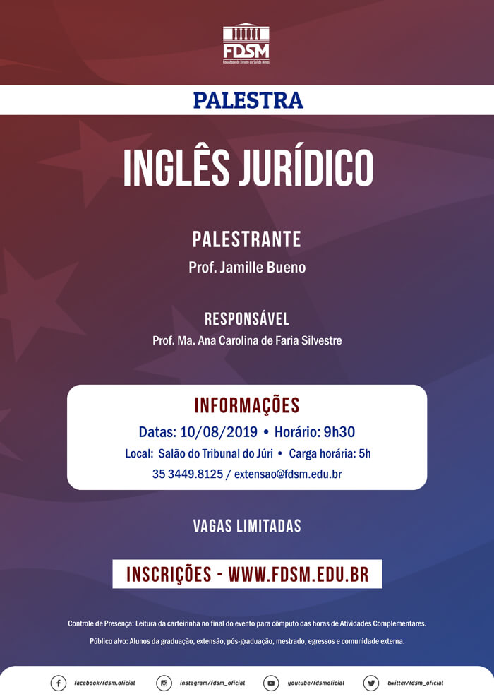 Inscrições abertas para a Palestra com o tema "Inglês Jurídico" sob a coordenação da Professora Mestra Ana Carolina de Faria Silvestre.