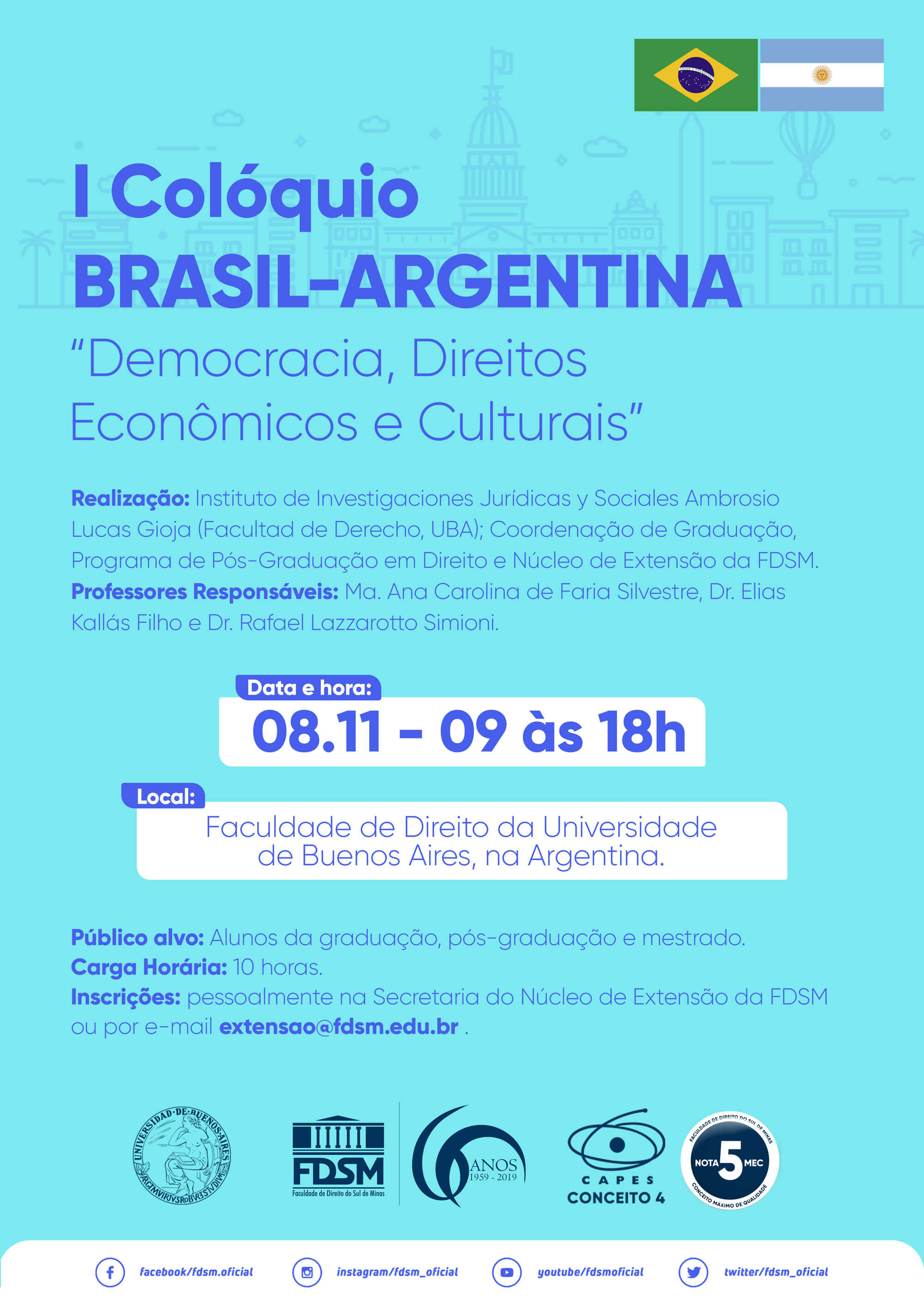 Inscrições abertas na secretaria do Núcleo de Extensão ou por e-mail, para o I Colóquio BRASIL-ARGENTINA "Democracia, Direitos Econômicos e Culturais" realizado pela FDSM em parceria com a Faculdade de Direito da Universidade de Buenos Aires (UBA) na Argentina.