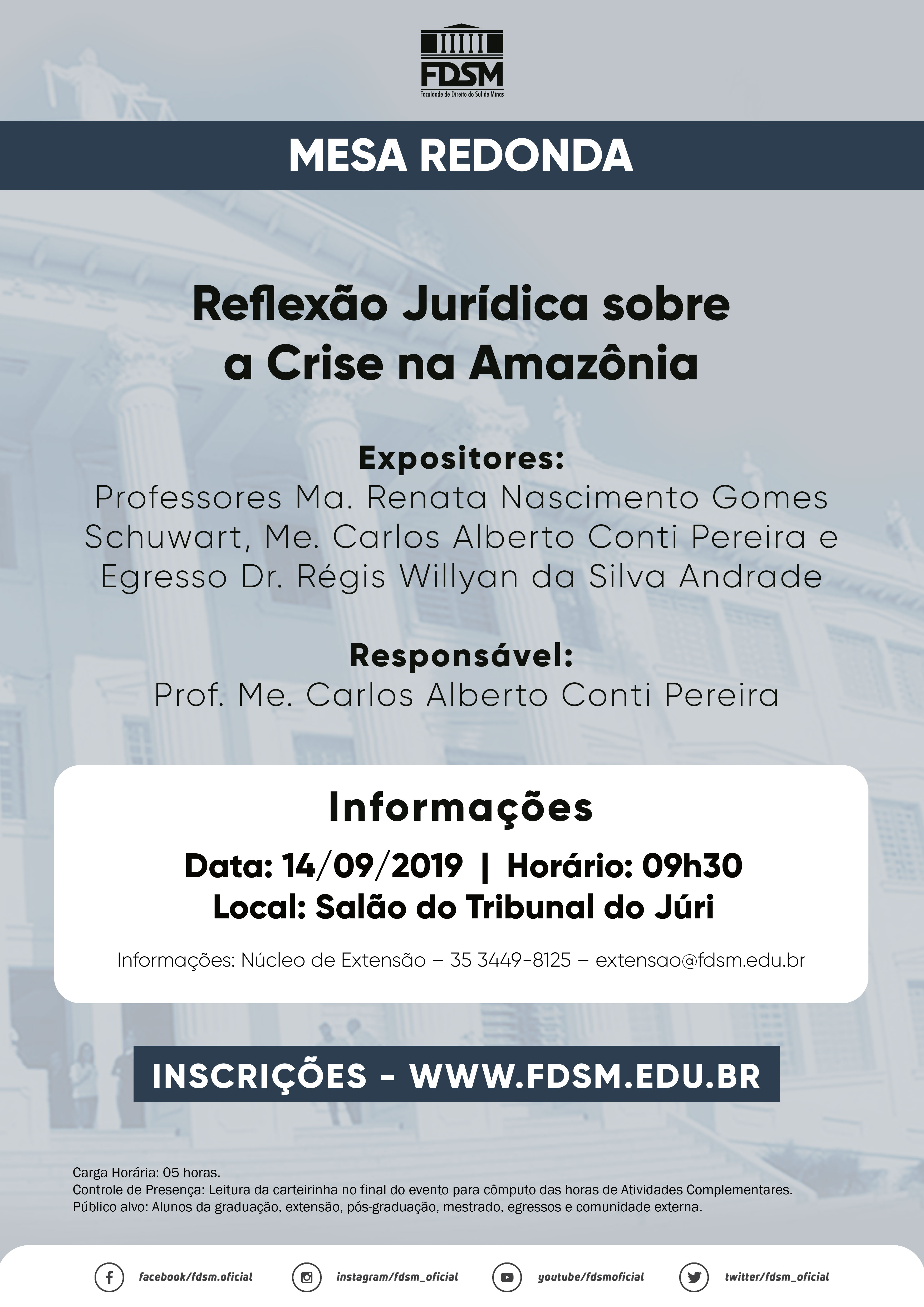 Inscrições abertas para a Mesa Redonda com o tema "Reflexão Jurídica sobre a Crise na Amazônia" sob a coordenação do Professor Mestre Me. Carlos Alberto Conti Pereira.