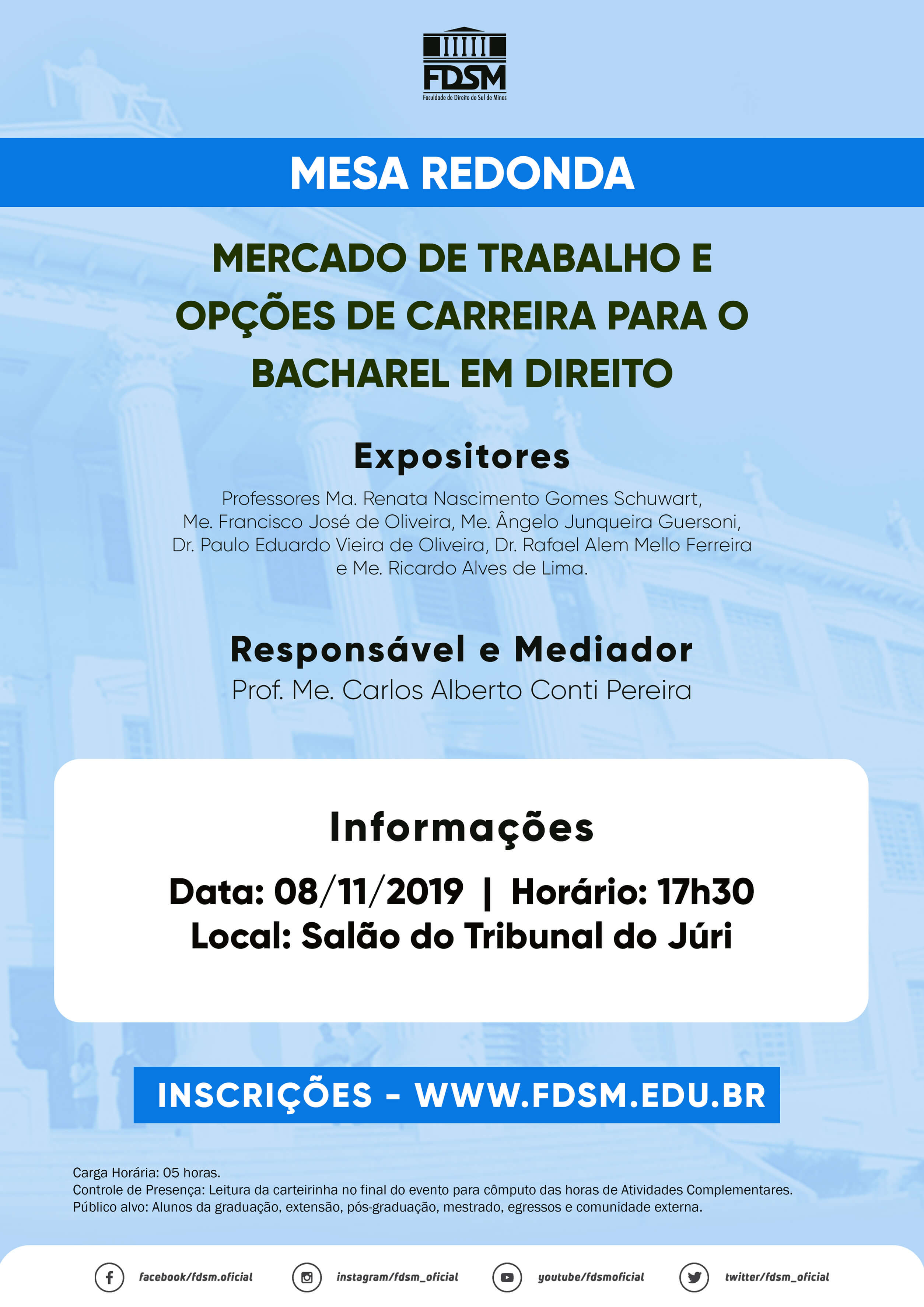 Inscrições abertas para a Mesa Redonda com o tema "Mercado de Trabalho e Opções de Carreira para o Bacharel em Direito" sob a coordenação do Professor Mestre Carlos Alberto Conti Pereira.