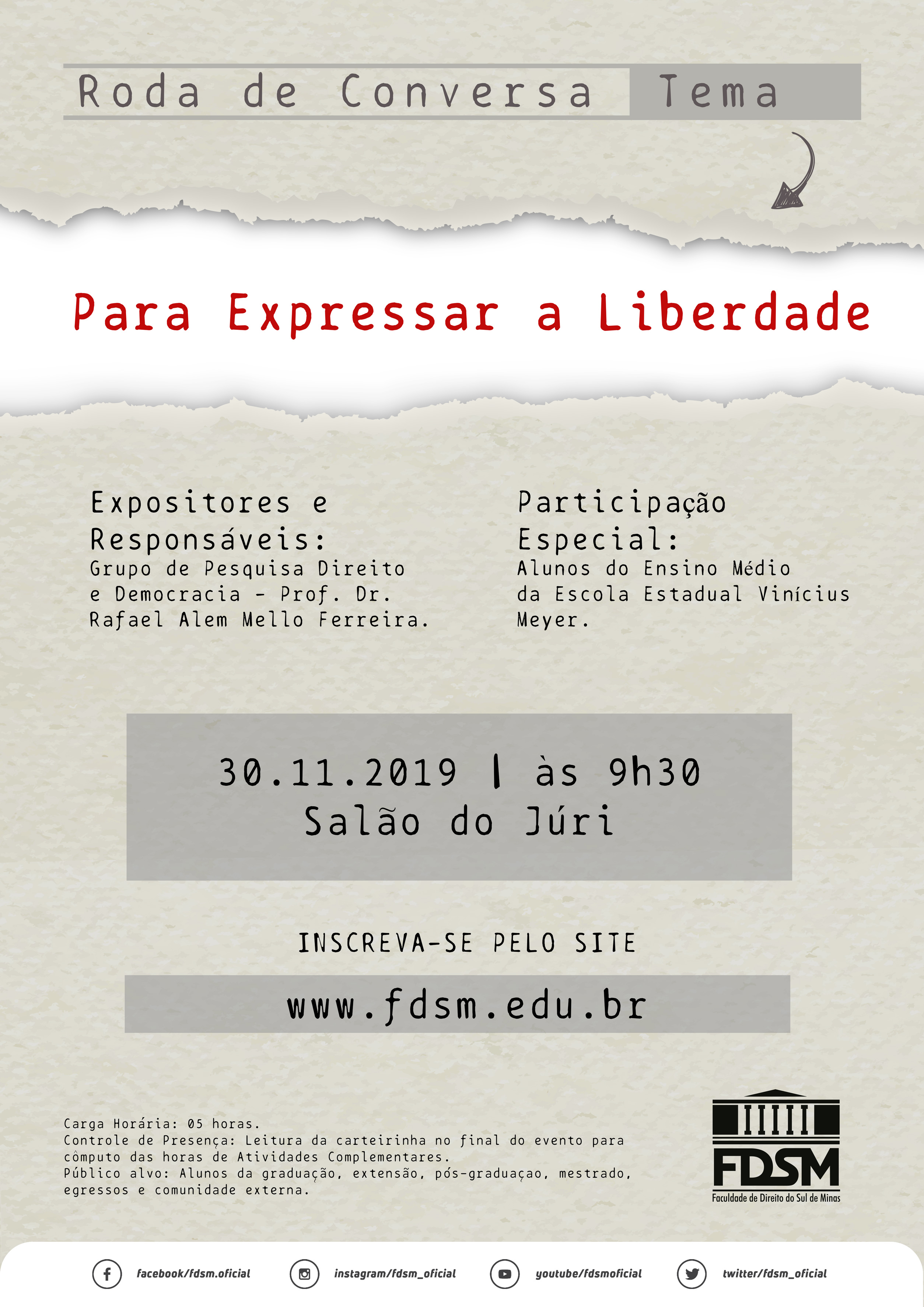 Inscrições abertas para a Roda de Conversa com o tema "Para Expressar a Liberdade" sob a coordenação do Grupo de Pesquisa Direito e Democracia, cujo Pesquisador-Líder é o Professor Doutor Rafael Alem Mello Ferreira.