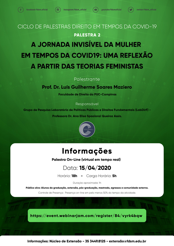 Inscrições abertas para a segunda Palestra do Ciclo com o tema "A Jornada Invisível da Mulher em Tempos da Covid-19: uma reflexão a partir das Teorias Feministas" sob a coordenação do Grupo de Pesquisa Laboratório de Políticas Públicas e Direitos Fundamentais (LabDirF), cuja Pesquisadora-líder é a Professora Doutora Ana Elisa Spaolonzi Queiroz Assis.