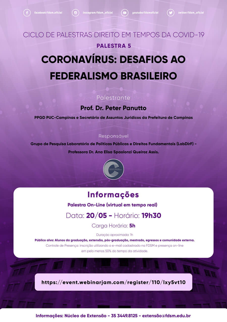 Inscrições abertas para a quinta Palestra do Ciclo com o tema "Coronavírus: desafios ao Federalismo brasileiro" sob a coordenação do Grupo de Pesquisa Laboratório de Políticas Públicas e Direitos Fundamentais (LabDirF), cuja Pesquisadora-líder é a Professora Doutora Ana Elisa Spaolonzi Queiroz Assis.