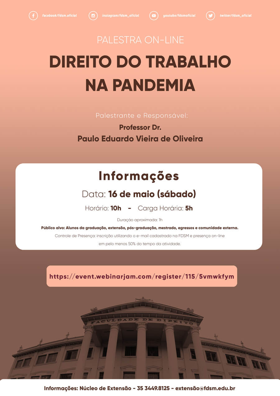 Inscrições abertas para a Palestra com o tema "Direito do Trabalho na Pandemia" sob a coordenação do Professor Doutor Paulo Eduardo Vieira de Oliveira.