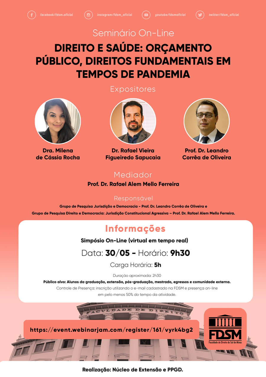 Inscrições abertas para o Seminário com o tema "Direito e Saúde: orçamento público, direitos fundamentais em tempos de pandemia" sob a coordenação dos Grupos de Pesquisa "Jurisdição e Democracia" e "Direito e Democracia: Jurisdição Constitucional Agressiva", cujos os Pesquisadores-líderes são os Professores Dr. Leandro Corrêa de Oliveira e Dr. Rafael Alem Mello Ferreira.