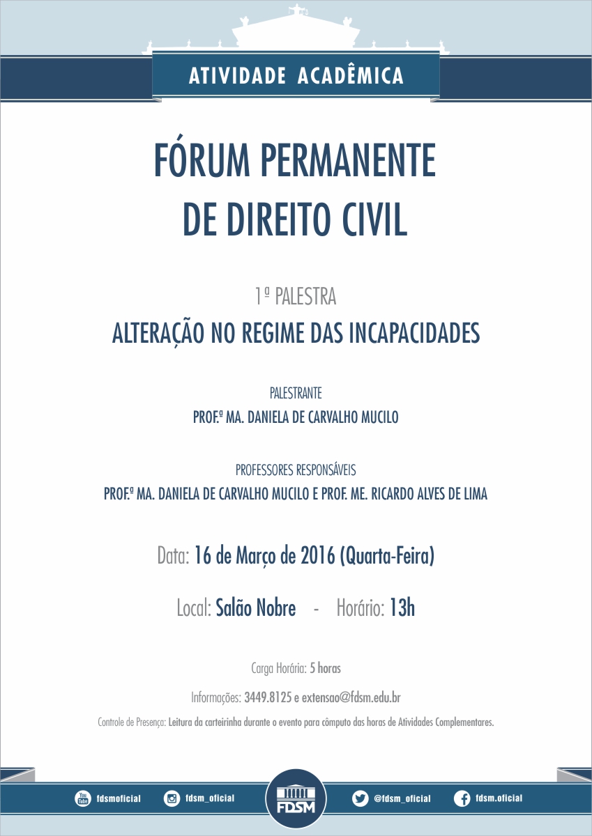Inscrições abertas para a primeira palestra do Fórum Permanente de Direito Civil com o tema "Alteração no Regime das Incapacidades" sob a coordenação dos Professores Ma. Daniela de Carvalho Mucilo e Me. Ricardo Alves de Lima.