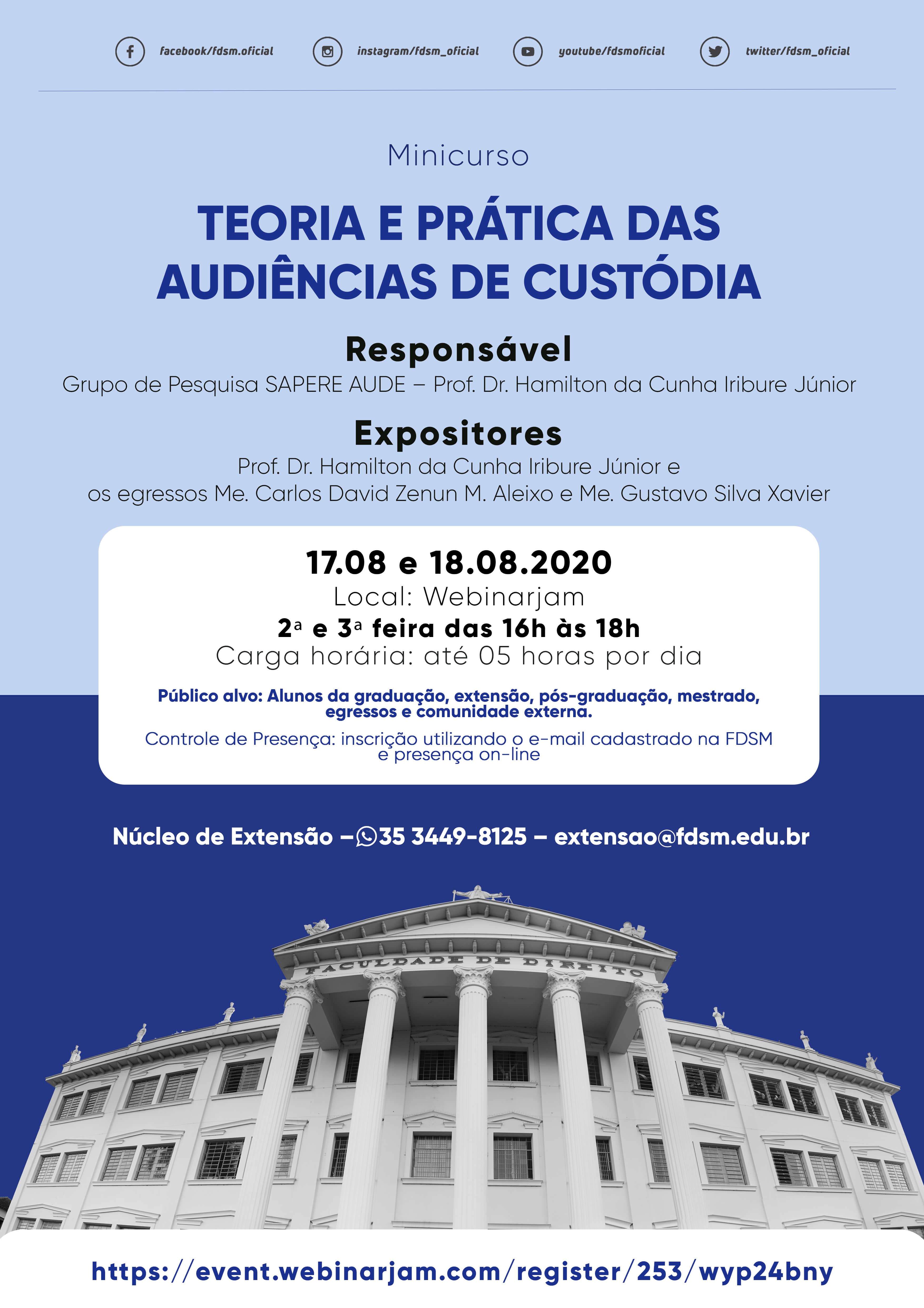 Inscrições abertas para o Minicurso com o tema "Teoria e Prática das Audiências de Custódia" sob a coordenação do Grupo de Pesquisa SAPERE AUDE, que tem como Pesquisador-Líder o Professor Dr. Hamilton da Cunha Iribure Júnior.