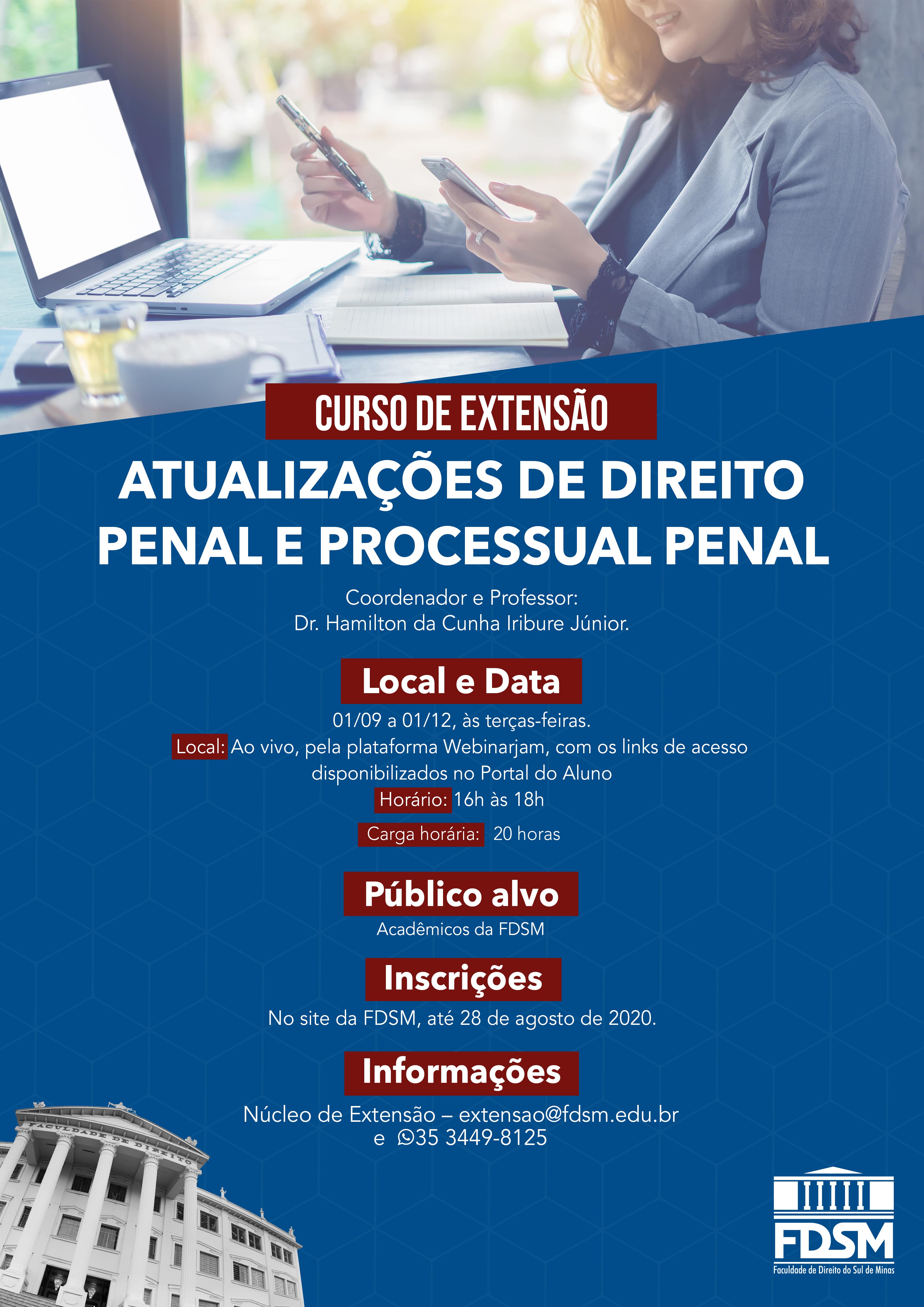 Ementa: Direito de punir. Teoria do Crime e da pena. Culpabilidade e punibilidade. Persecução criminal e sanção penal. Ação Processual Penal e suas espécies. Persecução criminal extraprocessual (investigações criminais). Sistemática processual e extraprocessual introduzida/reformada pela Lei n. 13.964/2019 (Pacote Anticrime). Investigações criminais e novas modalidades de acordos em matéria criminal. Ação Penal. Jurisdição e Competência. Prisões processuais e liberdade provisória. Atos processuais. Sentença e coisa julgada. Recursos penais. Ações Penais de natureza impugnativa. Relevantes impactos penais e processuais penais causados pela Lei n. 13.964/2019 e tendências jurisprudenciais.