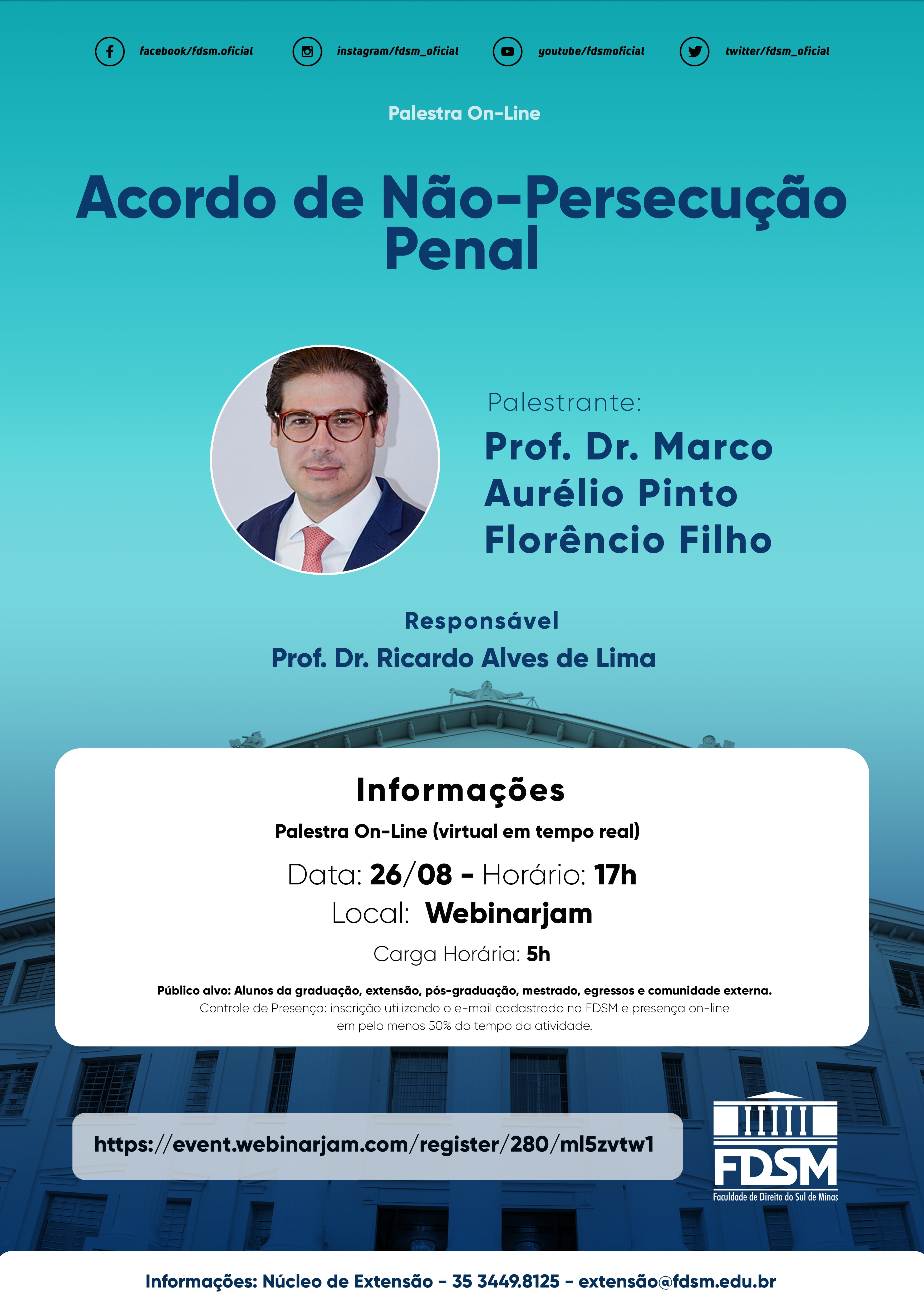Inscrições abertas para a Palestra on-line com o tema "Acordo de Não-Persecução Penal" sob a coordenação do Professor Doutor Ricardo Alves de Lima.