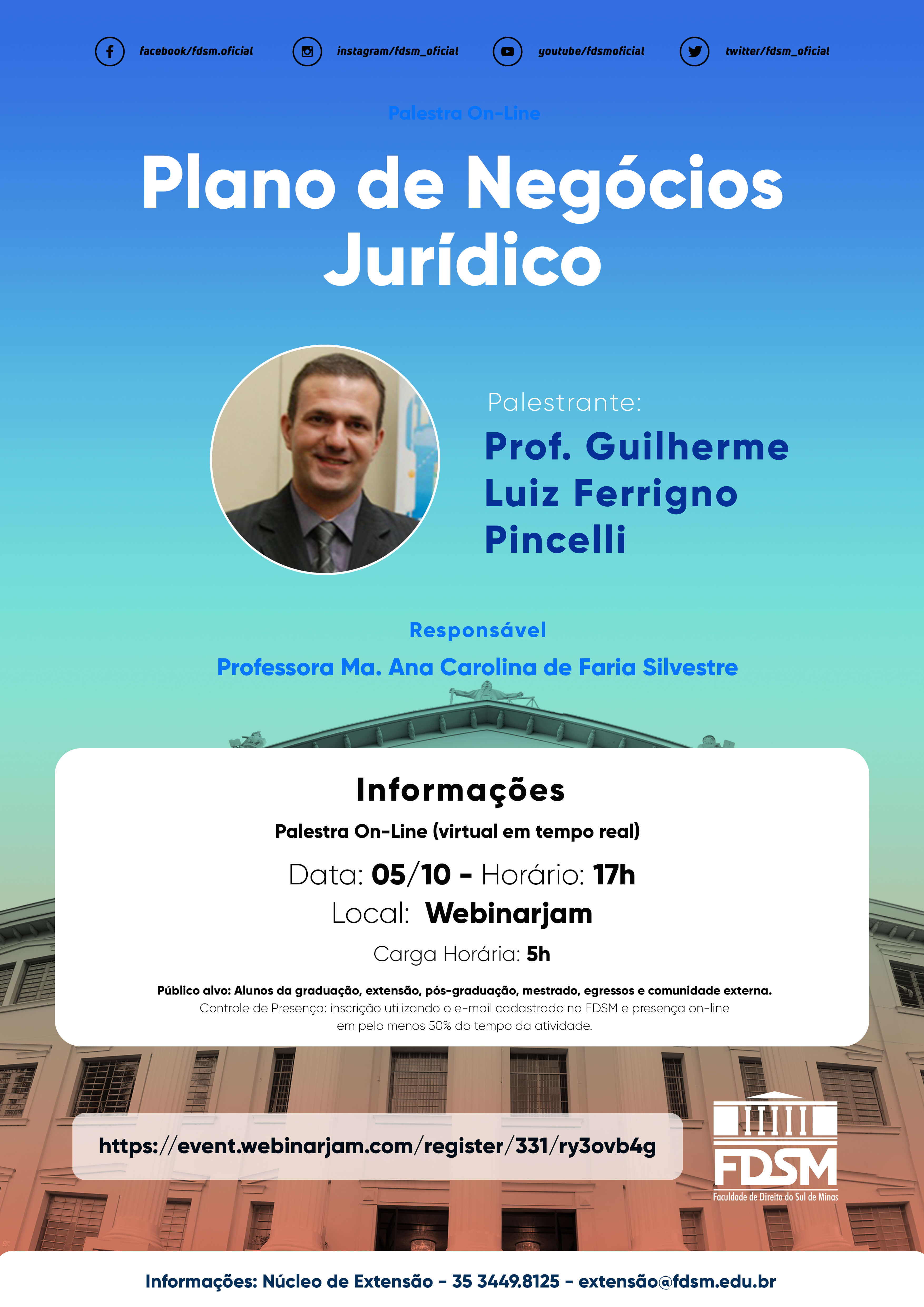 A atividade será transmitida no Webinarjam no dia 05/10/2020, segunda-feira, às 17h.