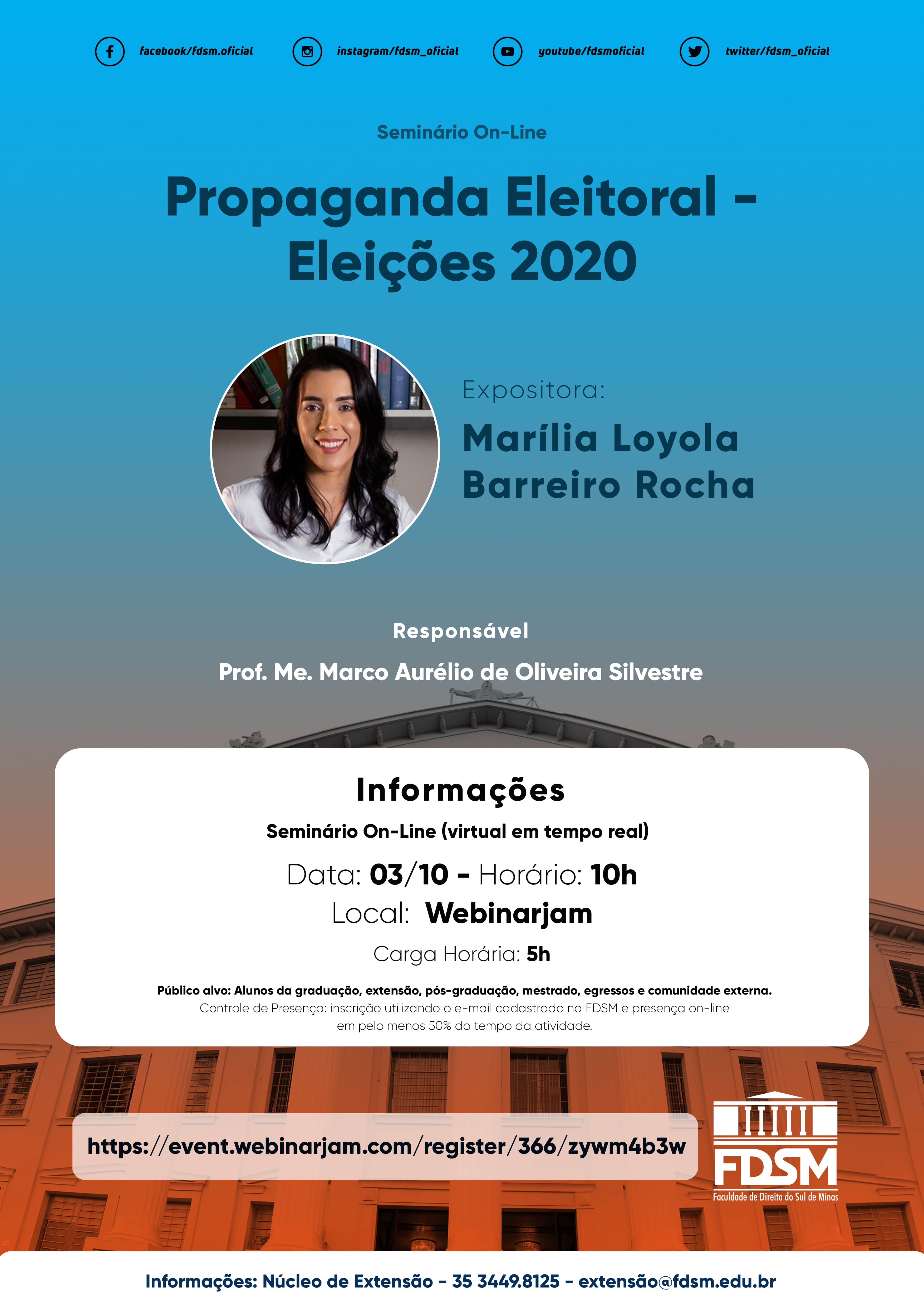 Inscrições abertas para o Seminário on-line com o tema "Propaganda Eleitoral - Eleições 2020" sob a coordenação do Professor Mestre Marco Aurélio de Oliveira Silvestre.
