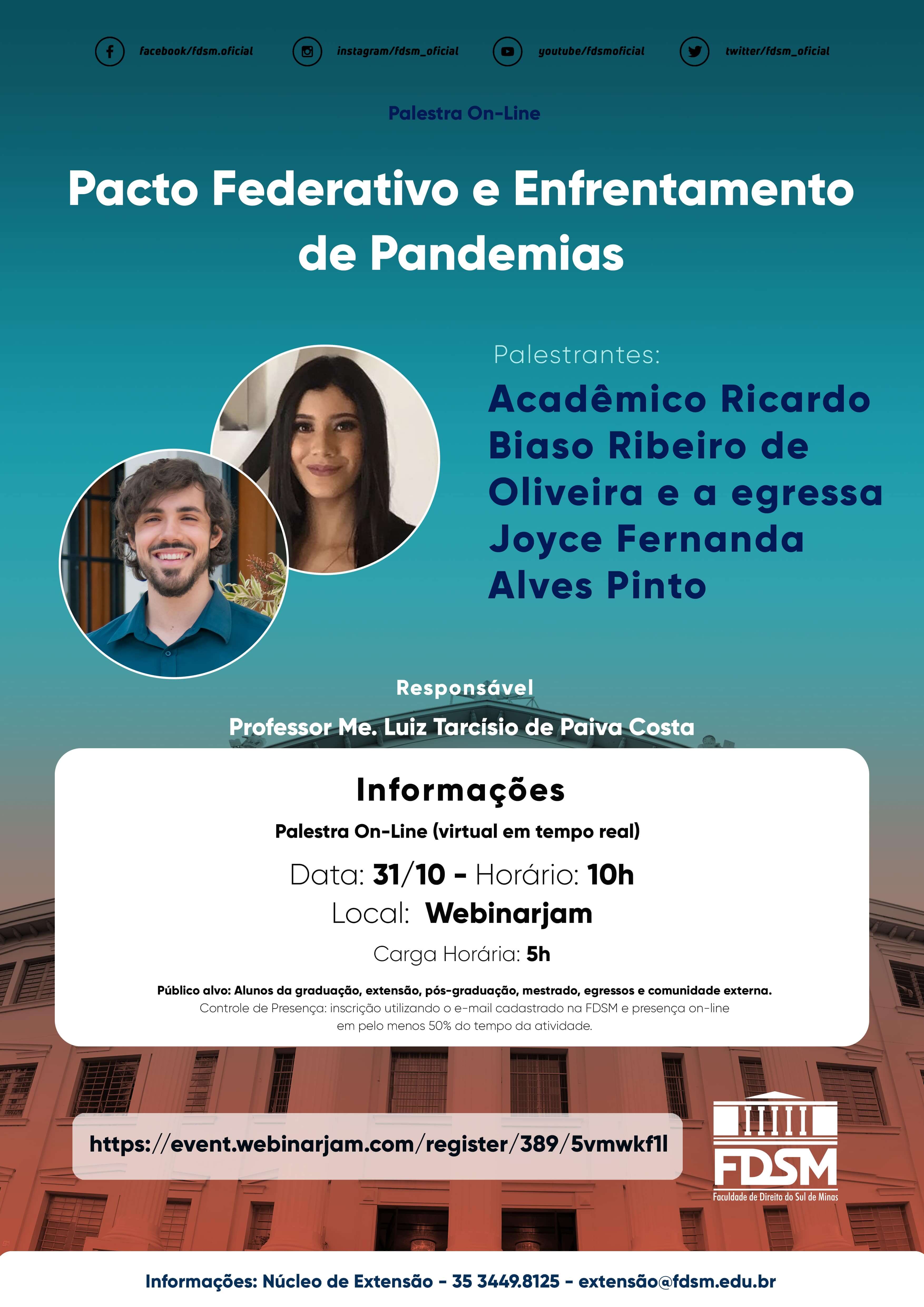 Inscrições abertas para a Palestra on-line com o tema "Pacto Federativo e Enfrentamento de Pandemias" sob a coordenação do Professor Mestre Luiz Tarcísio de Paiva Costa.