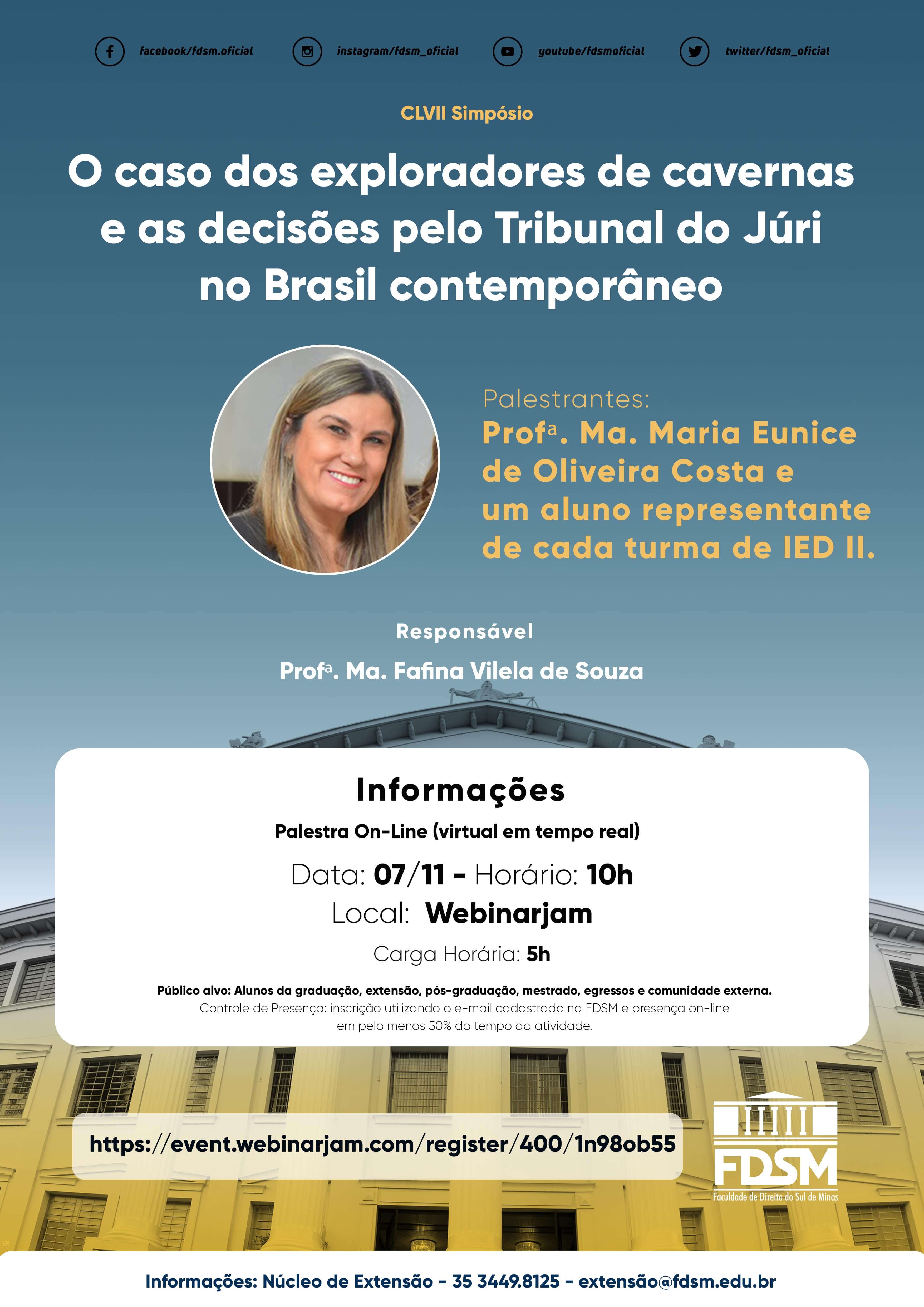 Inscrições abertas para o CLXII Simpósio on-line com o tema "O caso dos exploradores de cavernas e as decisões pelo Tribunal do Júri no Brasil contemporâneo" sob a coordenação da Prof.ª Ma. Fafina Vilela de Souza.