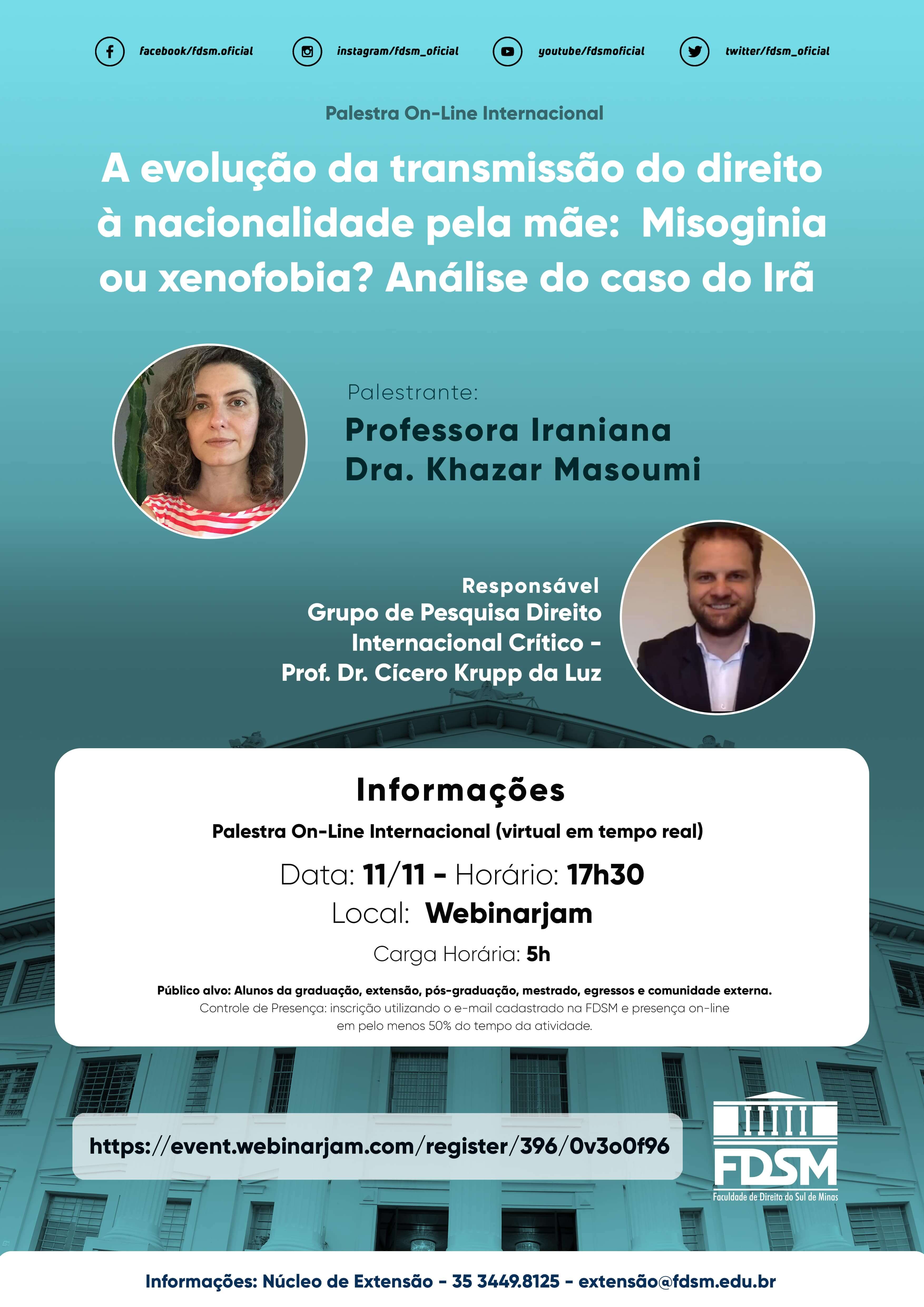 Inscrições abertas para a Palestra Internacional On-line com o tema "A evolução da transmissão do direito à nacionalidade pela mãe: Misoginia ou xenofobia? Análise do caso do Irã" sob a coordenação do Grupo de Pesquisa Direito Internacional Crítico cujo pesquisador-líder é o Prof. Dr. Cícero Krupp da Luz.