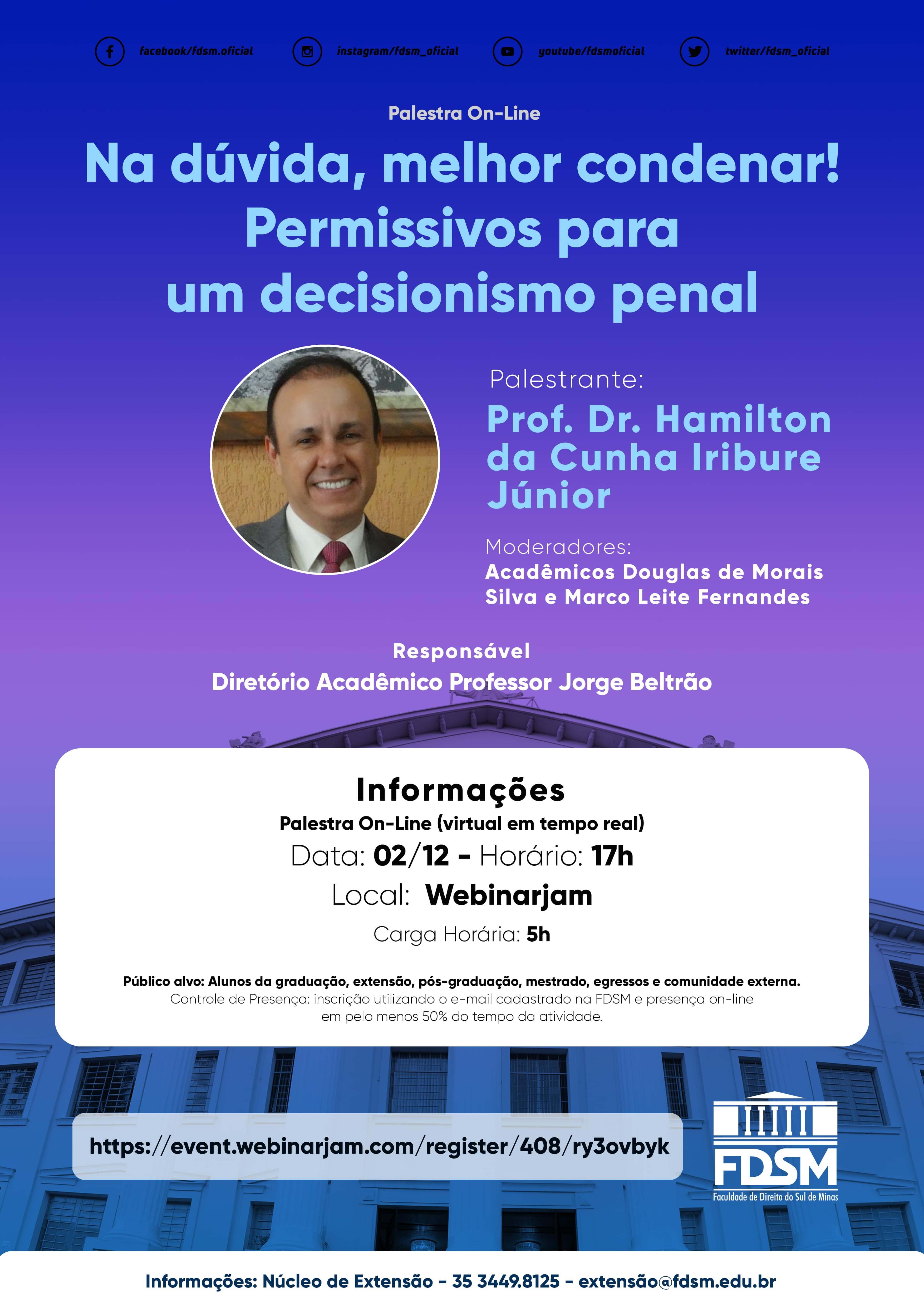 Inscrições abertas para a Palestra virtual com o tema "Na dúvida, melhor condenar! Permissivos para um decisionismo penal" sob a coordenação do Diretório Acadêmico Professor Jorge Beltrão.