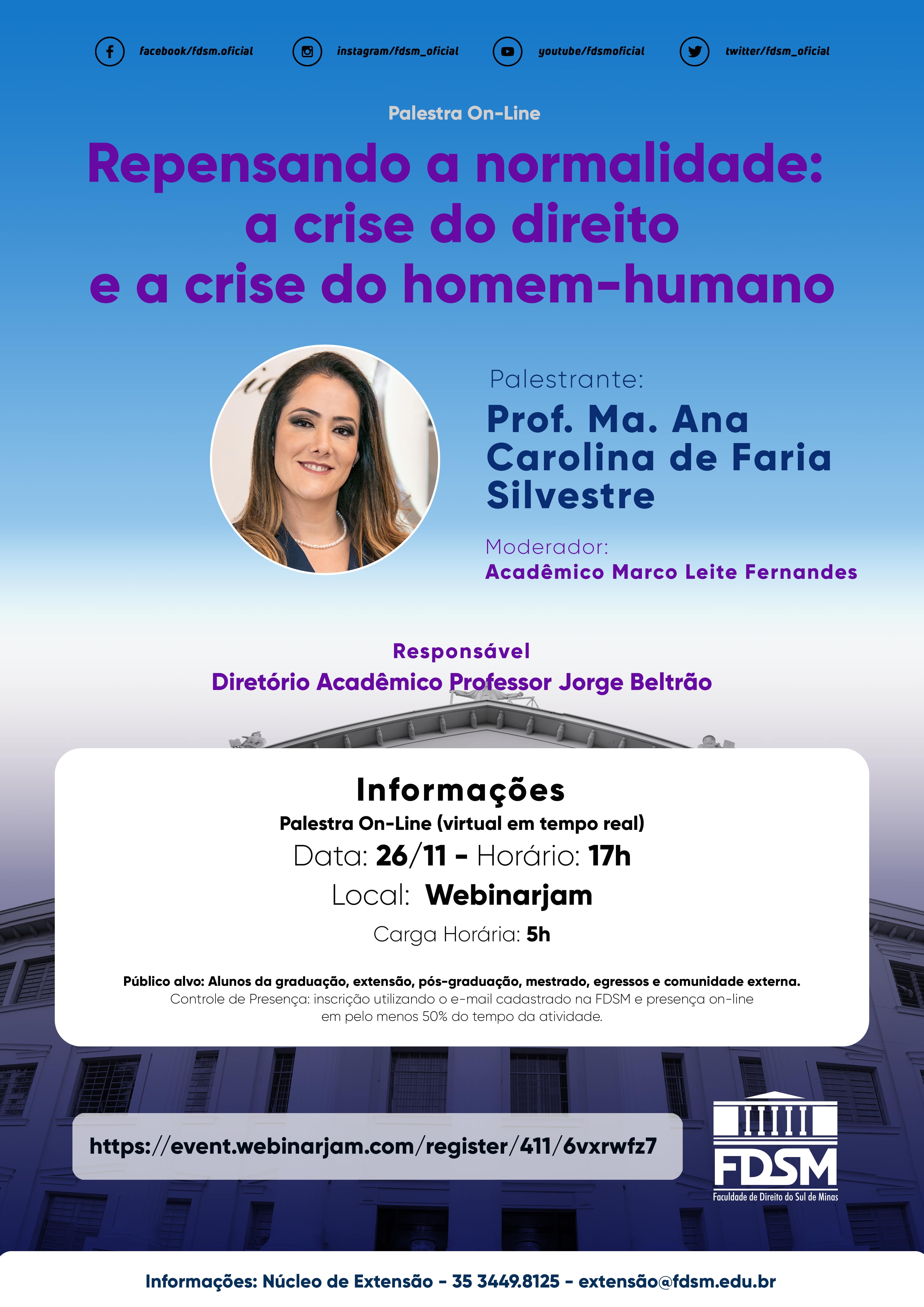 Inscrições abertas para a Palestra virtual com o tema "Repensando a normalidade: a crise do direito e a crise do homem-humano" sob a coordenação do Diretório Acadêmico Professor Jorge Beltrão.